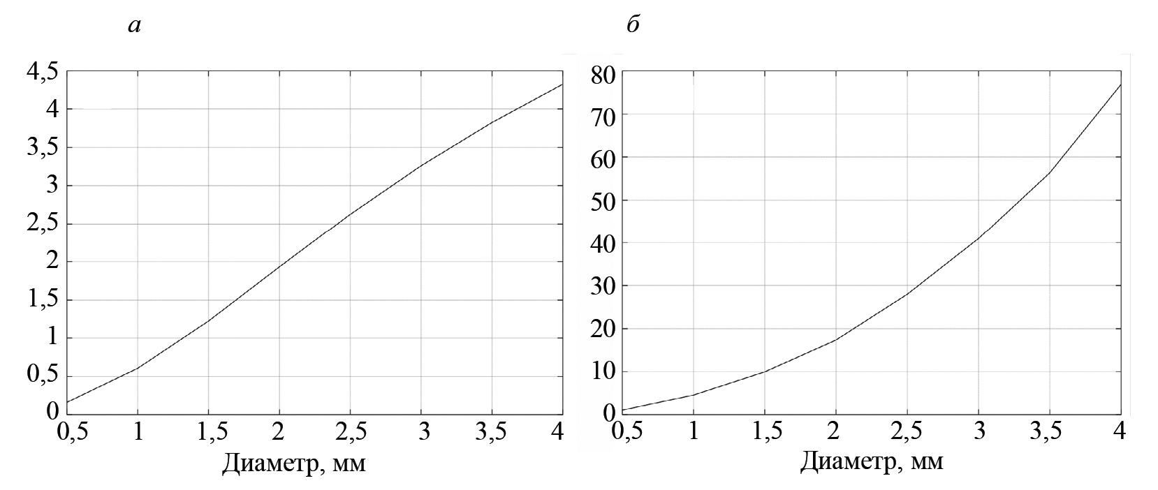 На рис. 2а показан график амплитуды индикации ЦФА-изображения I(xi, zi) при изменении диаметра ПДО от 0,5 до 4 мм, расположенного в точке (10, 35) мм. Видно, что график имеет тенденцию к насыщению, а диапазон изменения амплитуды индикации около 20. На рис. 2б представлен график амплитуды индикации в режиме интегральной амплитуды при использовании ЦФА—АРД-массива AIA(xi, zi, di). Видно, что эффекта насыщения нет, а диапазон изменения амплитуды индикации около 40, что должно позволить точнее определять значения больших диаметров эквивалентных ПДО.