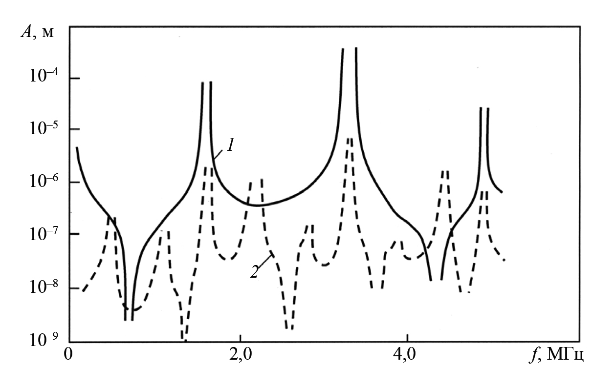 Рис. 3. АЧХ смещений свободной поверхности от сигналов АЭ дефекта: 1 — α = 1°, l = 5,0 · 10⁻³ м; 2 — α = 45°, l = 1,5 · 10⁻⁴ м; материал — Сталь 20.