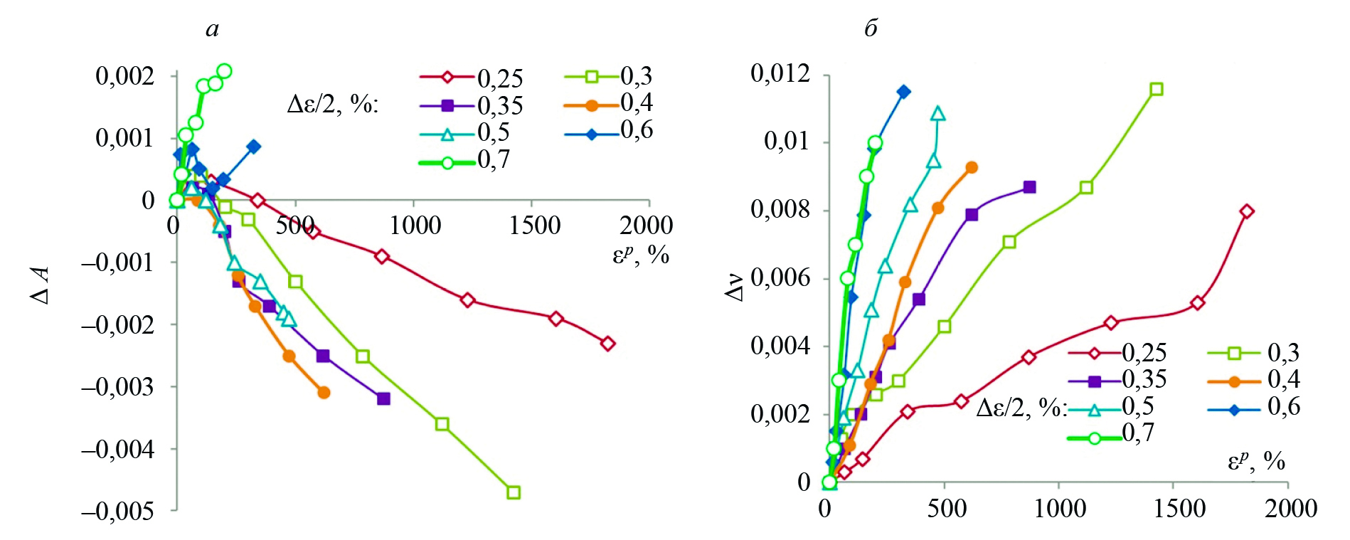 На рис. 3 приведены зависимости ΔA и Δν от величины накопленной пластической деформации εp для различных значений амплитуды деформации Δε/2.