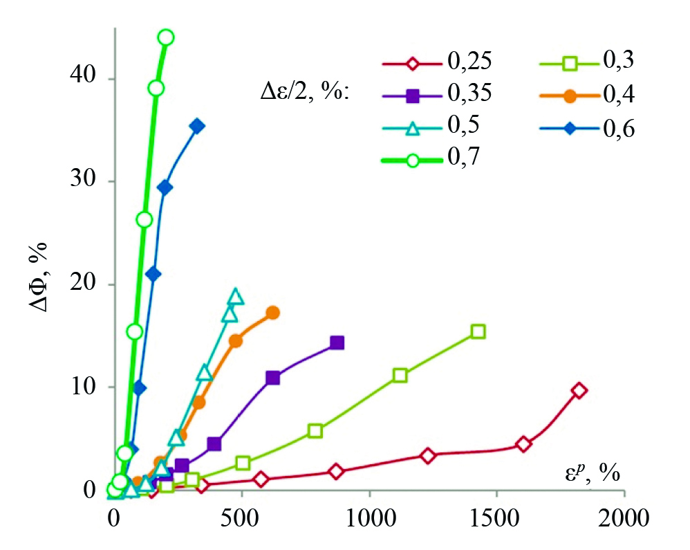 Целями работы является исследование влияния усталостного разрушения на коэффициент Пуассона и параметр акустической анизотропии при различных амплитудах деформации цикла, выявление связи этих параметров с ресурсными характеристиками метастабильной аустенитной стали. В качестве ресурсных характеристик в этой работе использовались поврежденность, определяемая согласно гипотезе линейного суммирования повреждений Пальмгрена−Майнера [15] как относительное число циклов нагружения, и относительная накопленная пластическая деформация [16].