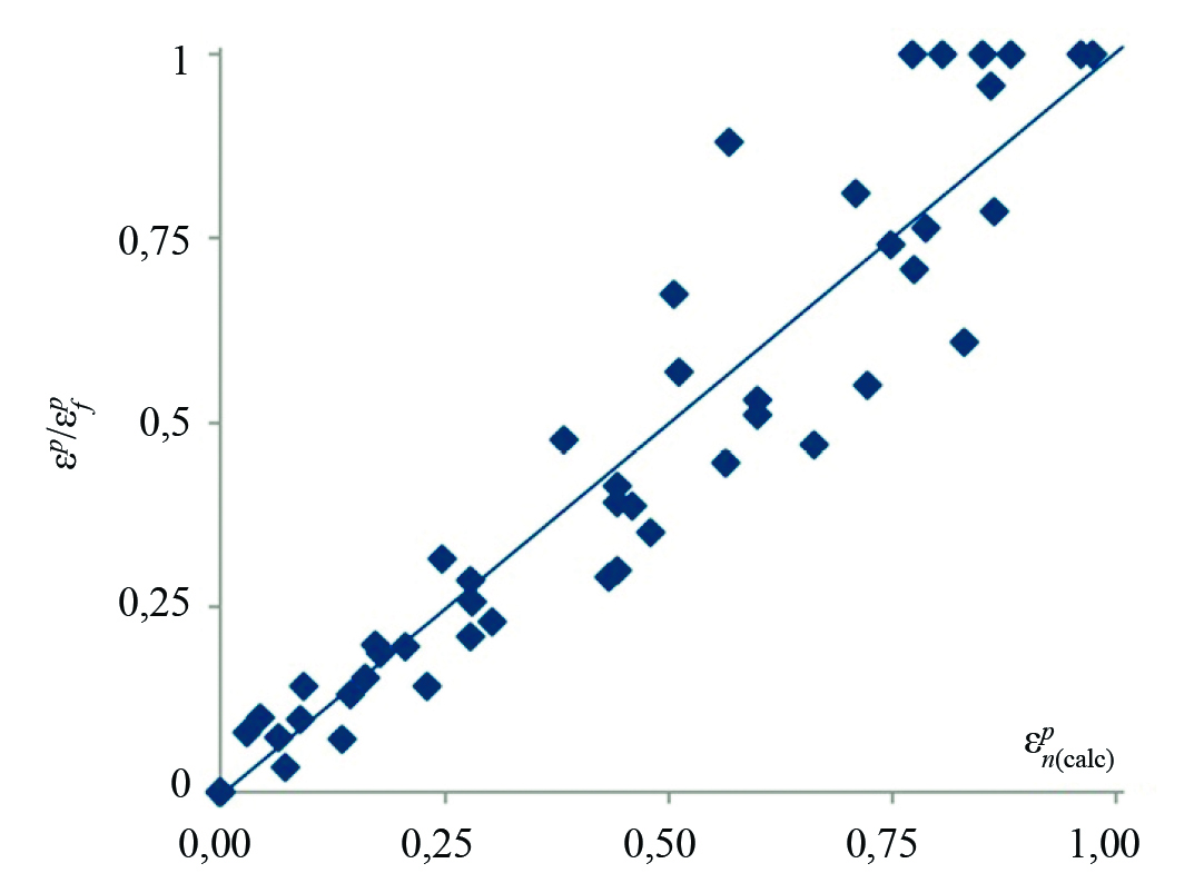 Рис. 7. Корреляционное поле между расчётной и экспериментальной относительной накопленной пластической деформации.