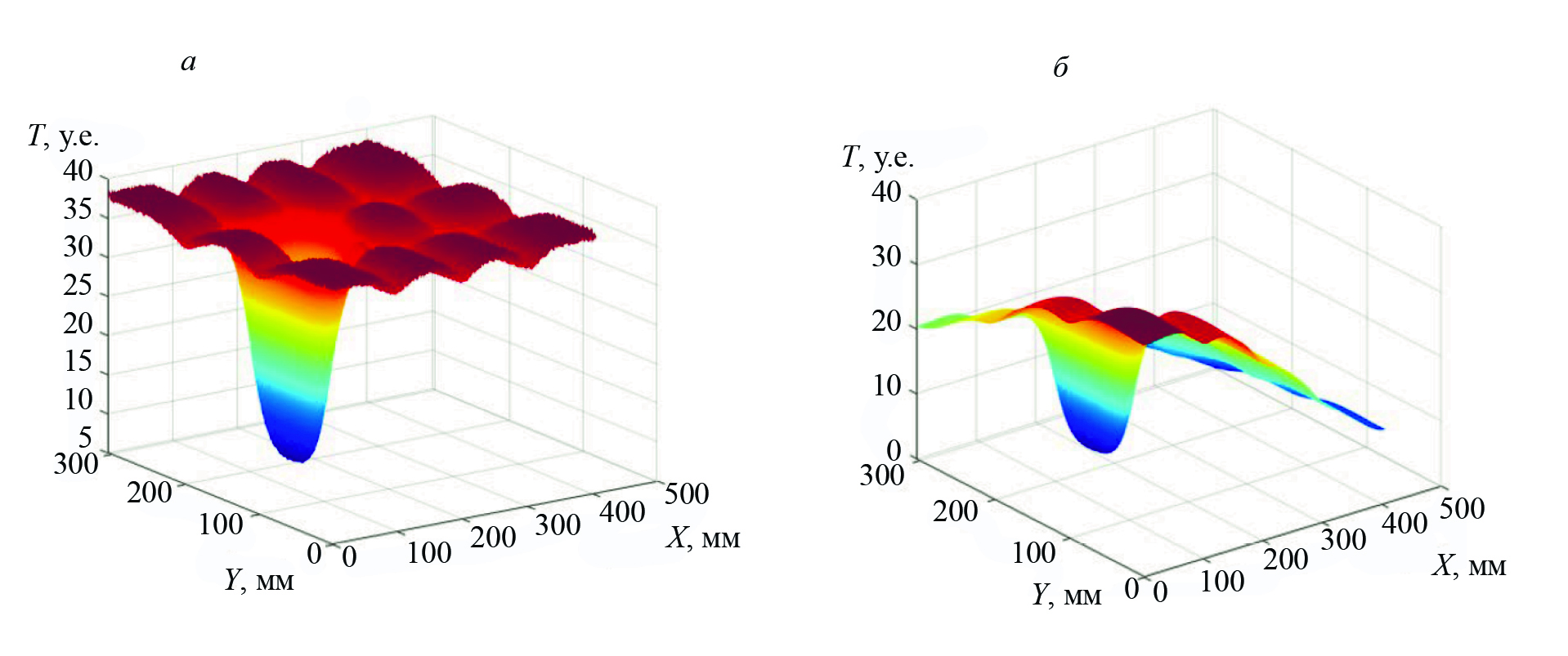 Рис. 5. 3D-распределения температуры в момент максимального сигнала ∆Tm (50 % воды в вертикальной панели): а — равномерный нагрев; б — неравномерный нагрев.
