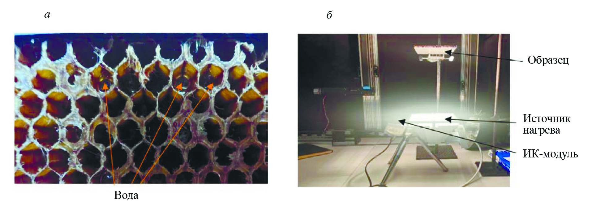 Рис. 6. Ячейки сот с водой (а) и экспериментальная установка (б).