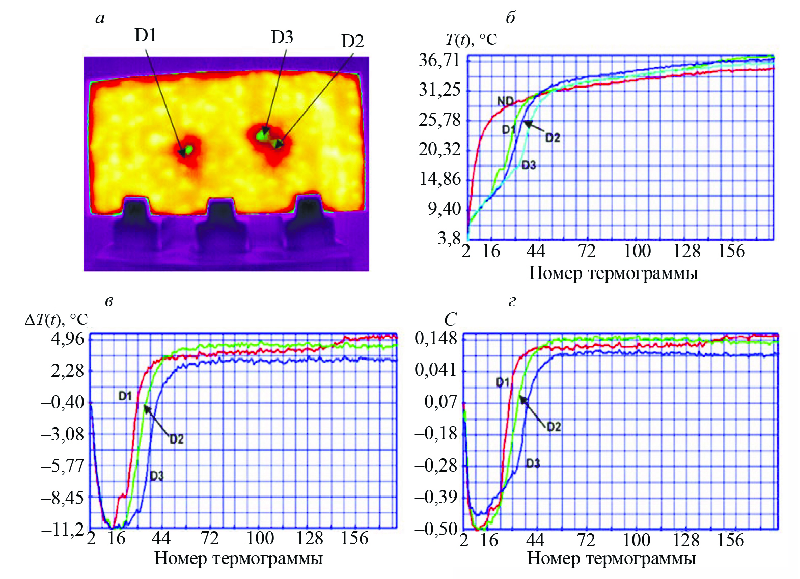 Рис. 10. Активный ТК воды в сотах в случае фазового перехода лед/вода (D1: 25 %; D2: 50 %; D3: 100 %; ND — бездефектная зона): а — исходная термограмма; б — температура; в — температурный сигнал; г — температурный контраст.