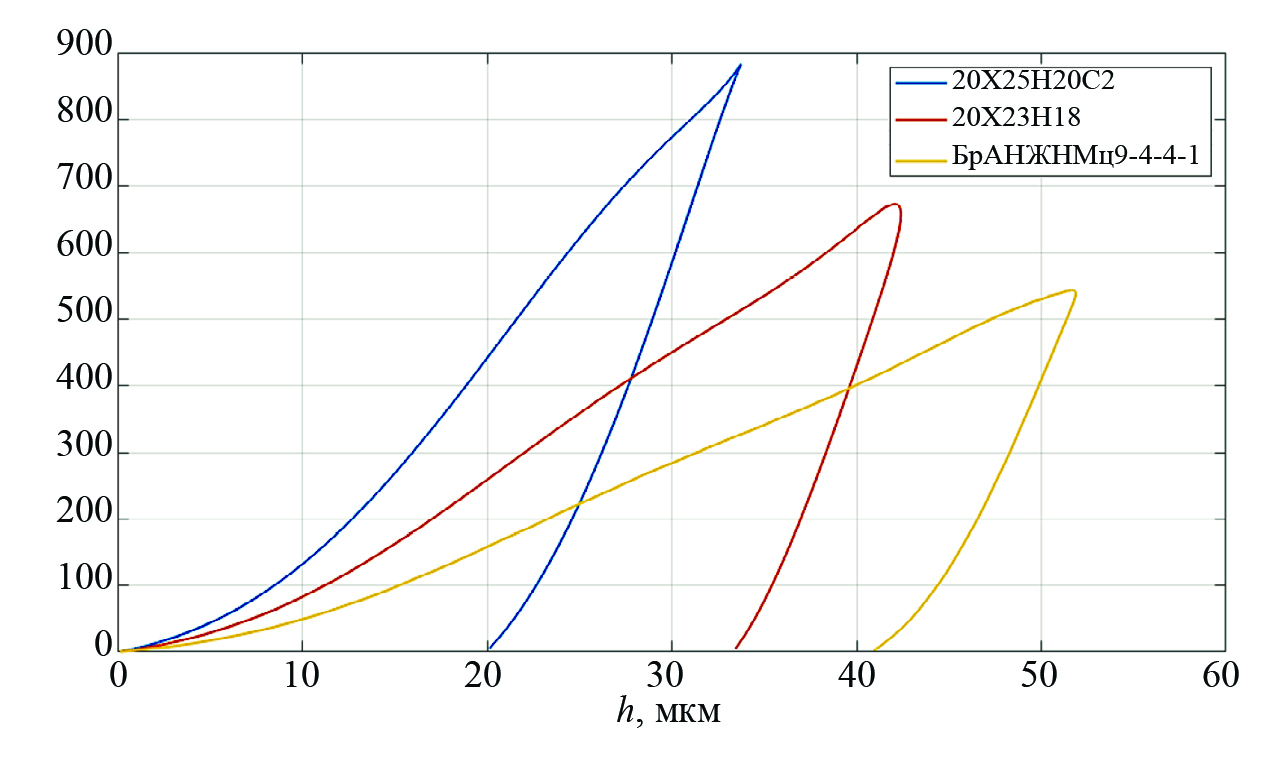 Рис. 3. Рассчитанные диаграммы контактное усилие — глубина внедрения для образцов сплавов 20Х25Н20С2, 20Х23Н18 и БрАНЖНМц9-4-4-1.