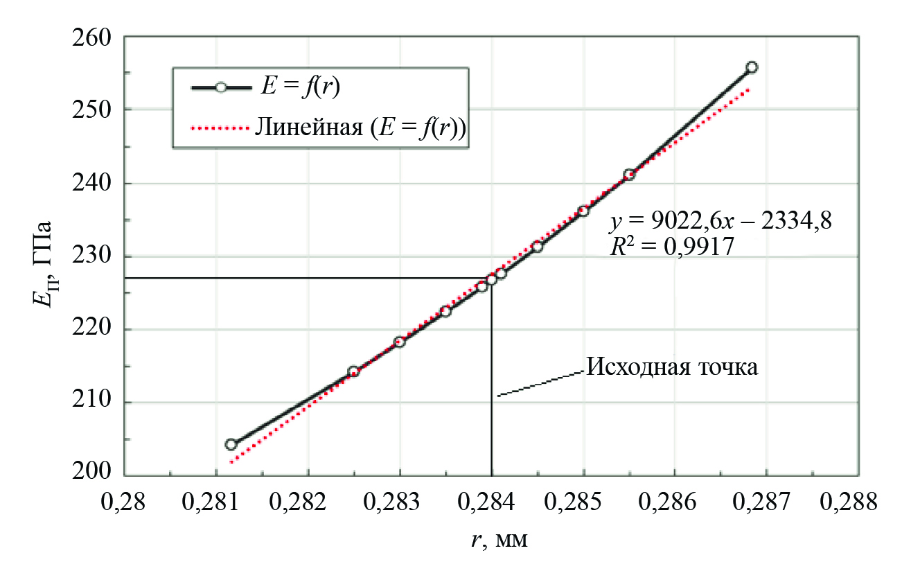 Рис. 4. Зависимость рассчитанного модуля от измеренного радиуса.