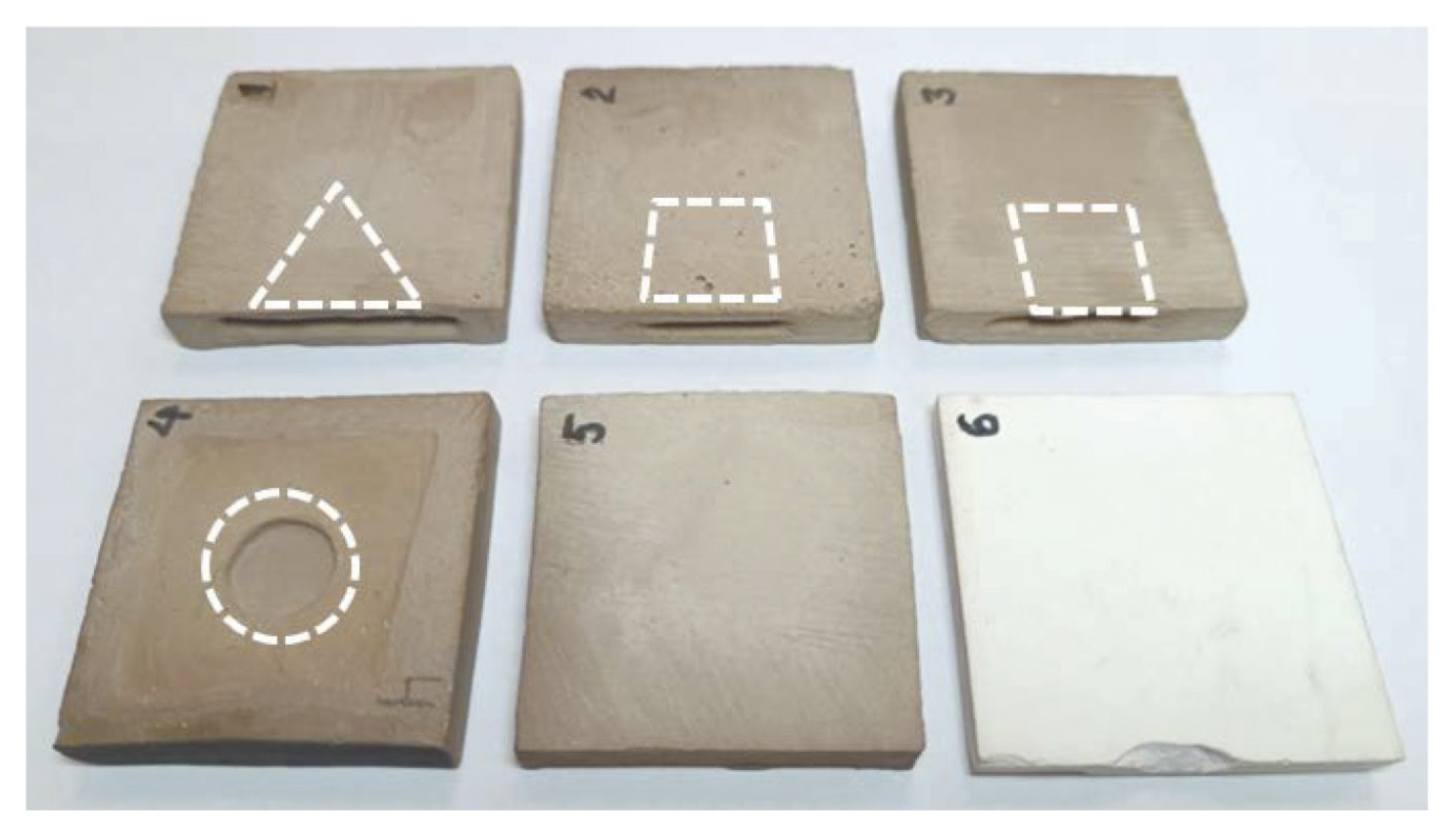 В качестве исходного вещества для изготовления образцов применяли оксид алюминия (Al2O3) с различным содержанием спекающей добавки на основе MnO2. Образцы в виде плиток размером 55×55×10 мм (рис. 1) изготовили методом шликерного литья в гипсовые формы. После извлечения из формы образцы сушили и подвергали предварительному обжигу при температуре 1100 °С для достижения механической прочности, достаточной для формирования искусственных дефектов. Подготовленные плитки проходили окончательный совместный обжиг в воздухе при температуре 1550 °С в течение 2 ч.