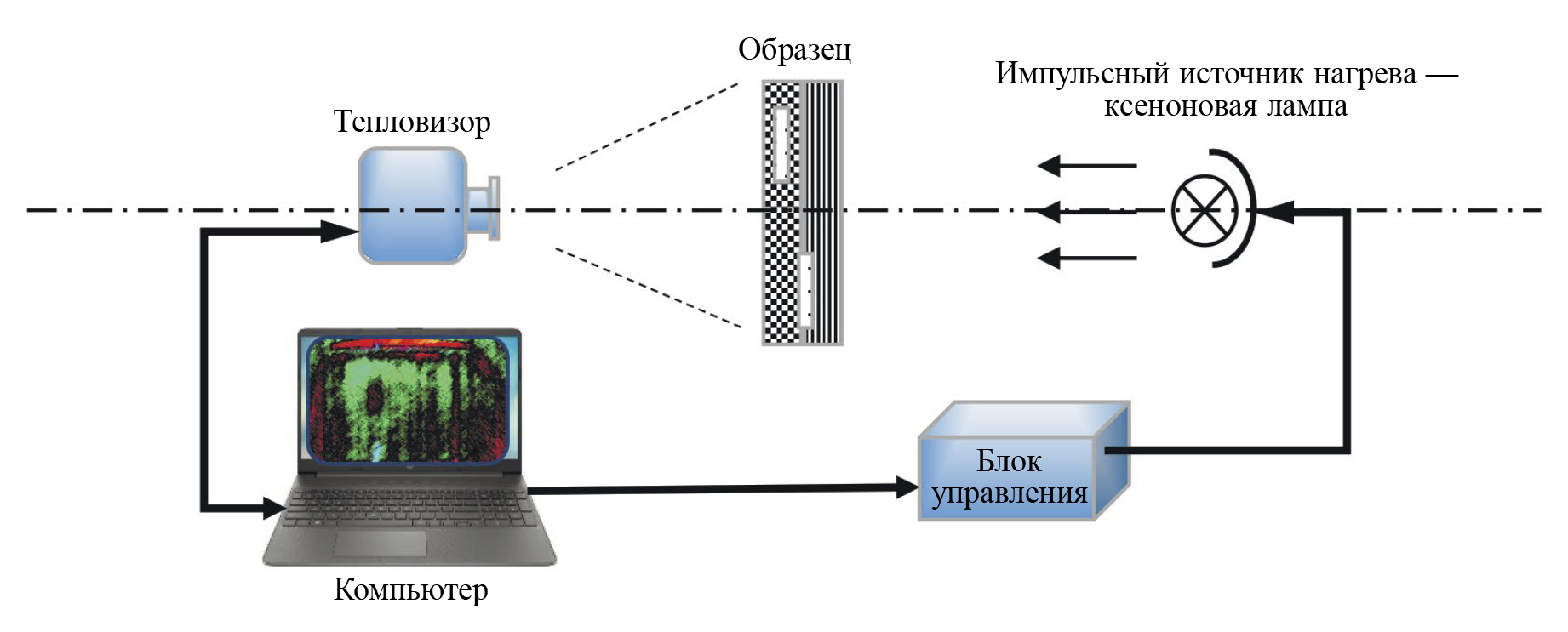 Образцы были исследованы с использованием методики двухстороннего активного ТК, предусматривающей бесконтактный оптический нагрев поверхности контролируемого изделия с одновременной регистрацией инфракрасных (ИК) термограмм [16], отражающих распределение температуры на контролируемой поверхности в пространстве и во времени, с помощью тепловизора. Схема ТК приведена на рис. 2.
