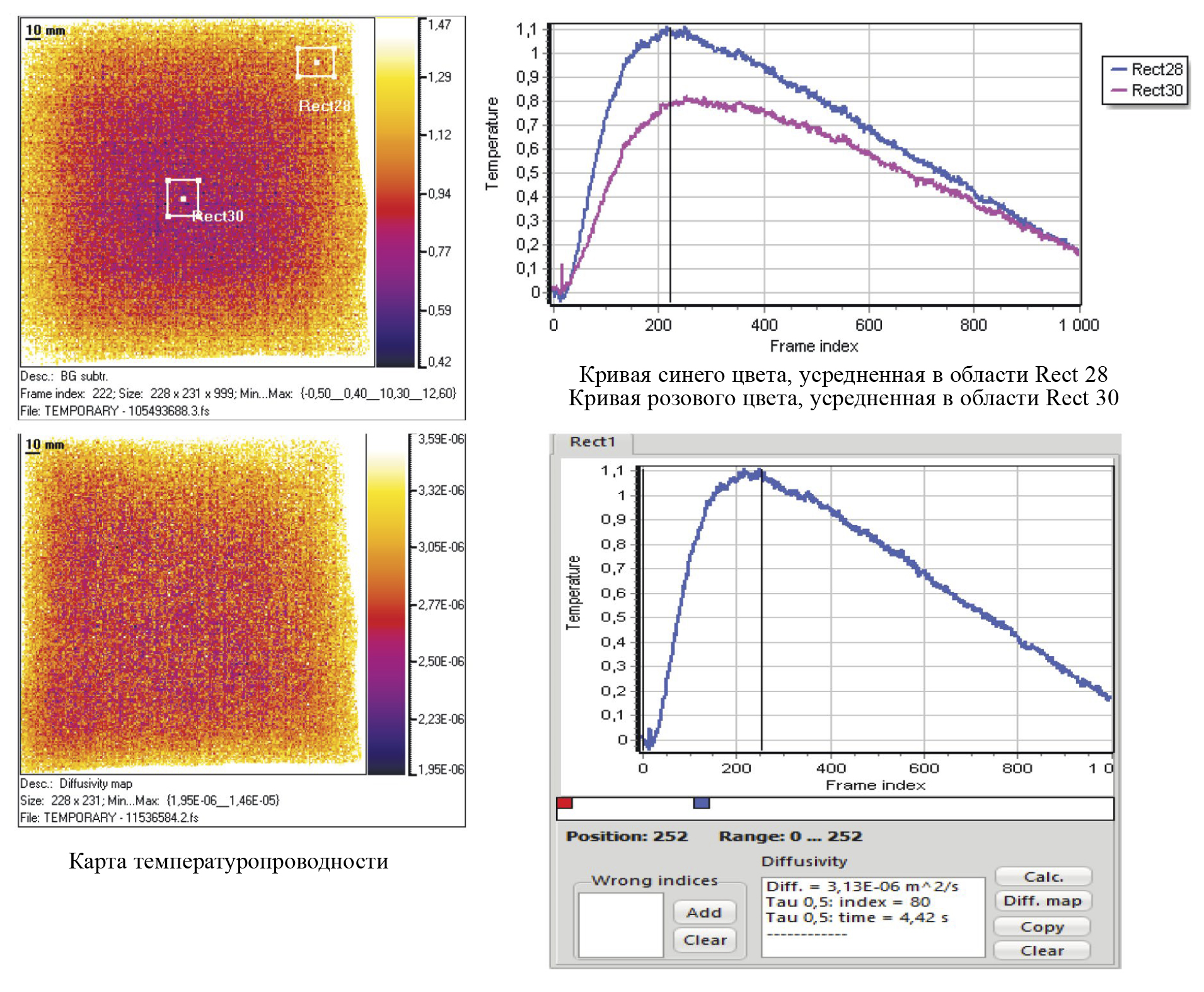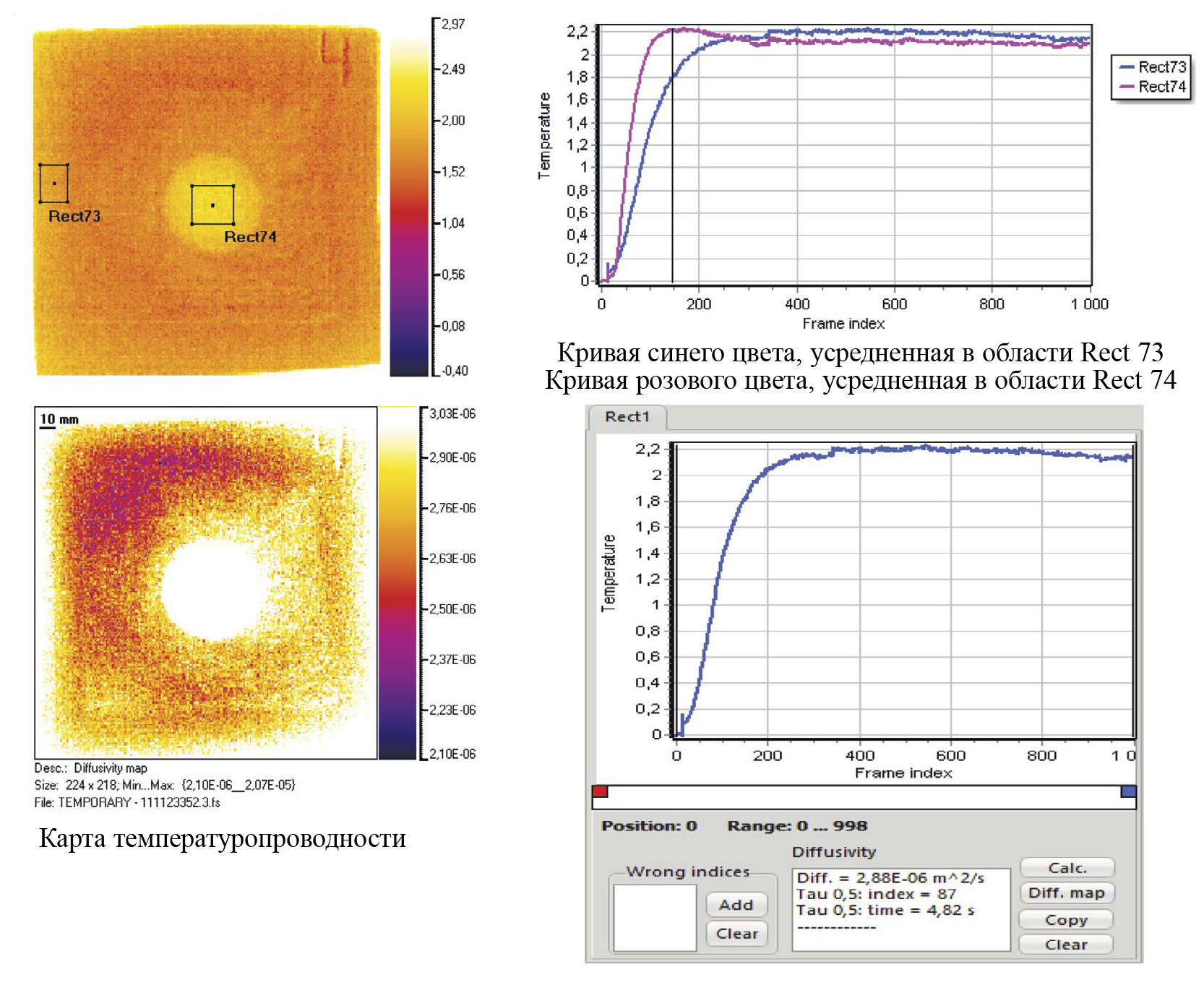Рис. 5. Исходная термограмма и профиль температуры во времени, а также карта температуропроводности при двухстороннем ТК бездефектного образца 6.