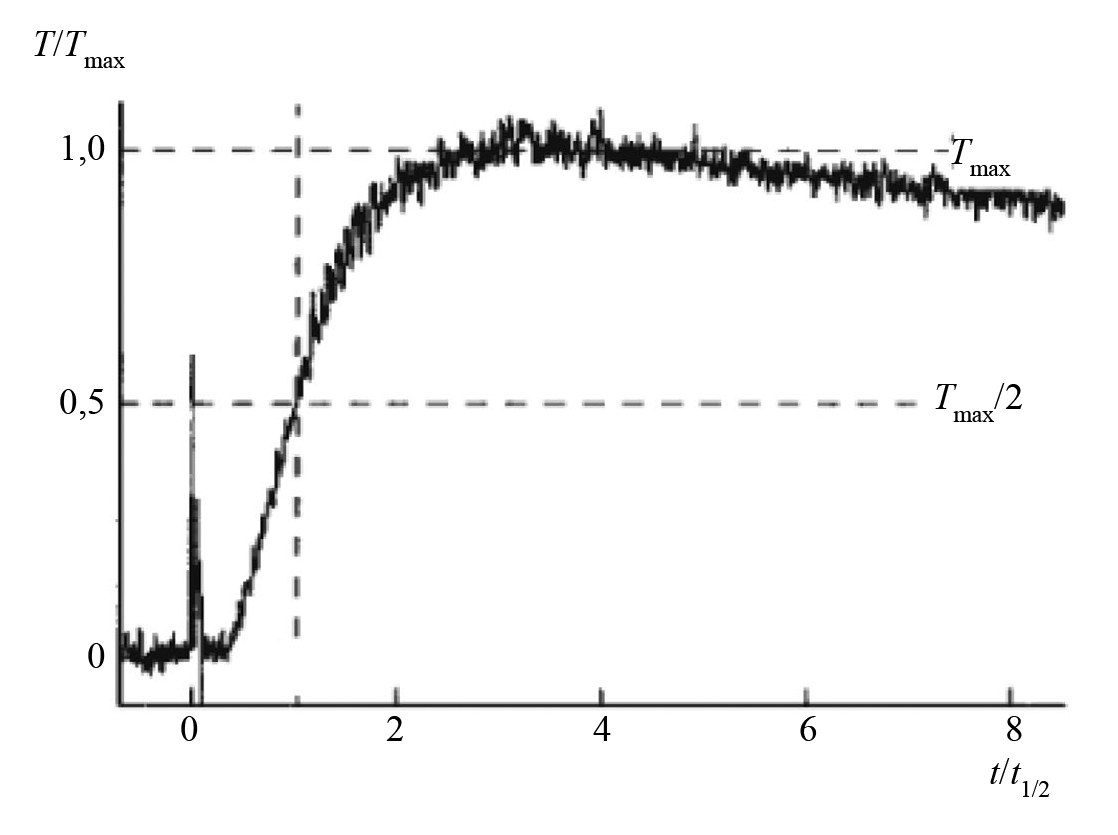 Рис. 4. Кривая нагрева — график зависимости температуры обратной поверхности образца от времени при определении температуропроводности по методу Паркера (ГОСТ Р 57943—2017).