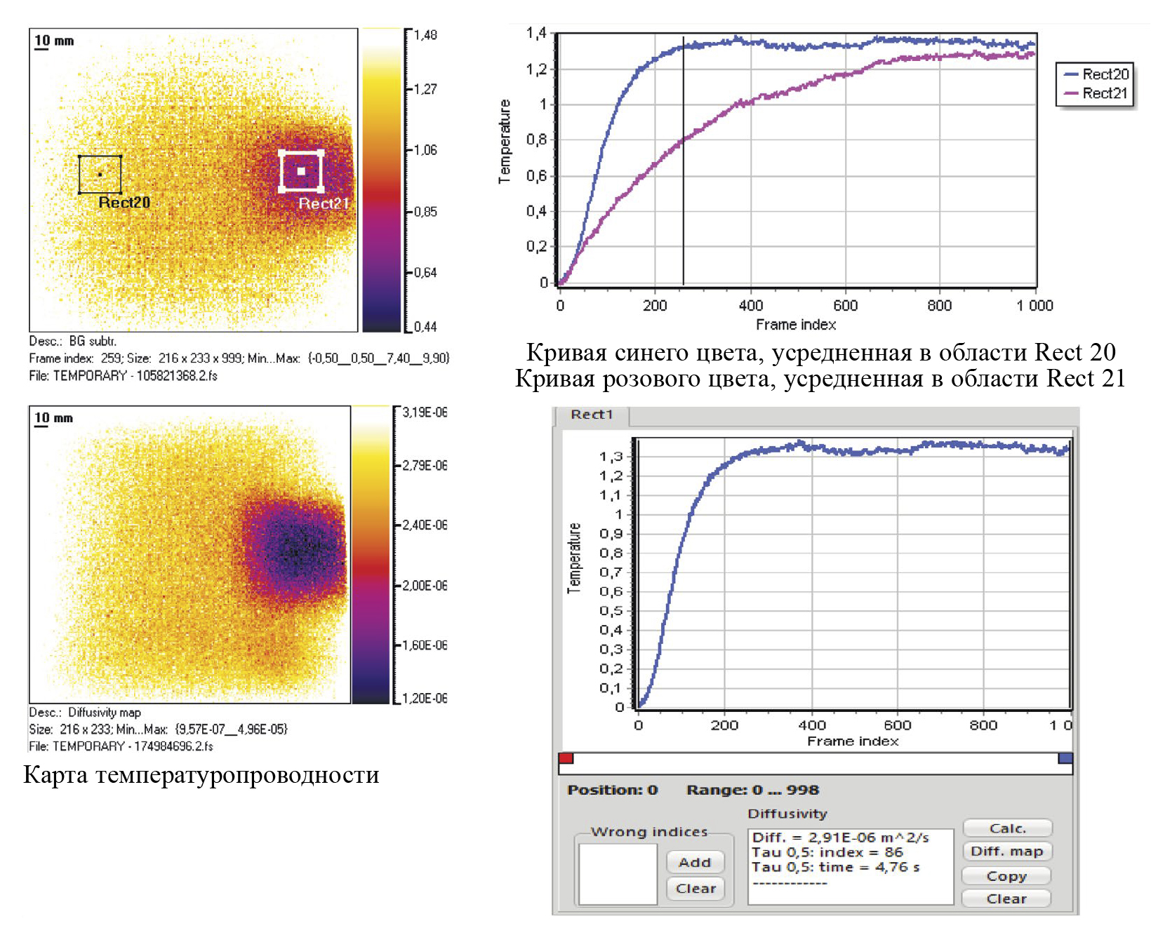 Рис. 9. Исходная термограмма и профиль температуры во времени, а также карта температуропроводности при двухстороннем ТК дефектного образца 4.
