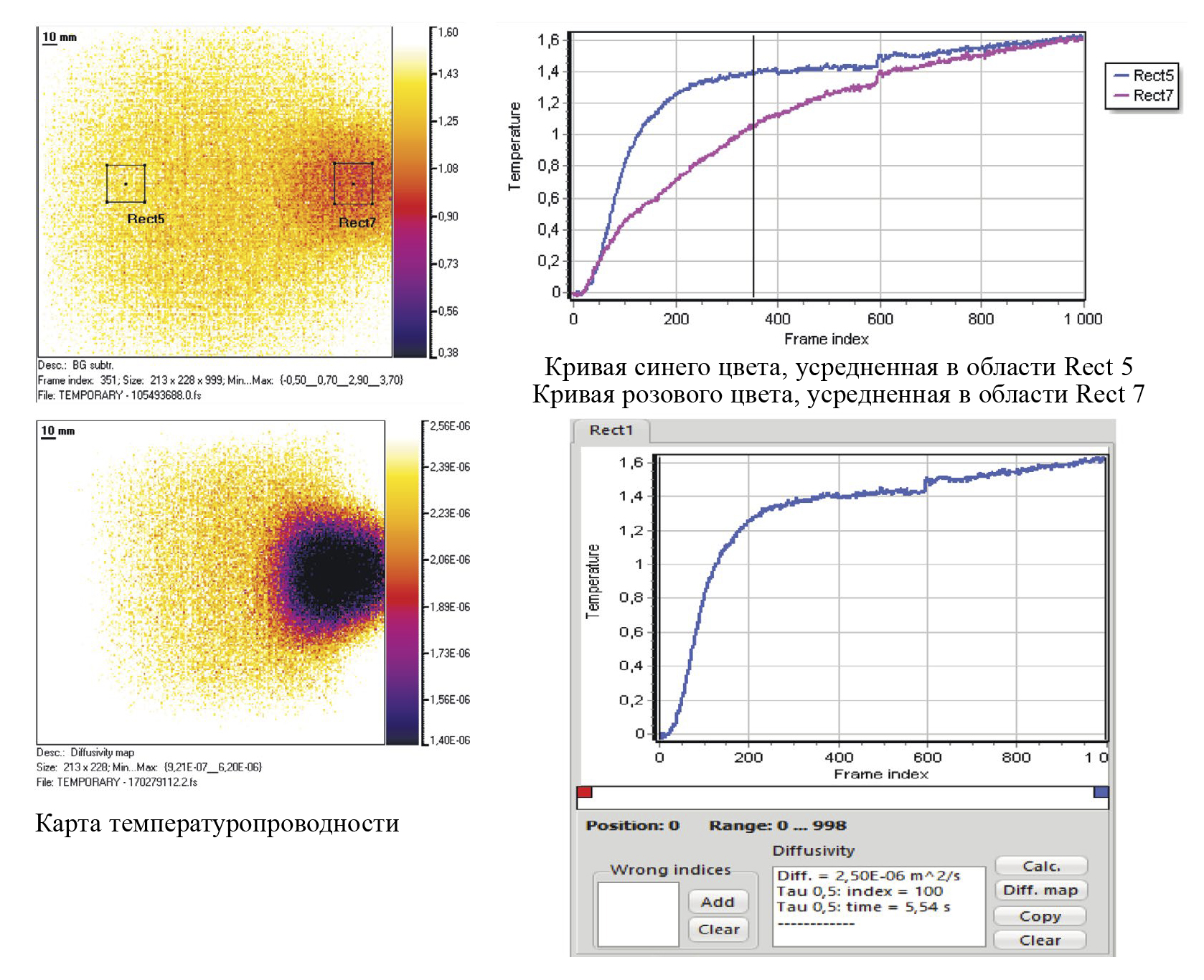 Рис. 3. Исходная термограмма и профиль температуры во времени, а также карта температуропроводности при двухстороннем ТК бездефектного образца 5.