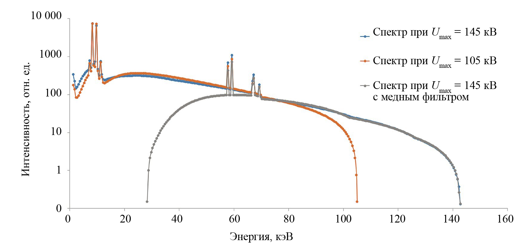 Также приводится спектр, рассчитанный для случая, когда импульсное излучение с амплитудой напряжения 145 кВ прошло через медный фильтр толщиной 0,5 мм. В данном случае по спектру видно, что низкоэнергетическое излучение поглощается фильтром. Интенсивность приводится в относительных единицах, чтобы нагляднее представить изменение спектральных составов для данных случаев. Спектр, полученный при максимальном напряжении и с применением медного фильтра, нормирован по высокоэнергетической составляющей относительно спектра, полученного при 145 кВ без фильтра. Это позволяет показать долю отсекаемых низкоэнергетических квантов. Спектр, полученный при максимальном напряжении на трубке 105 кВ, нормирован по низкоэнергетической части спектра относительно спектра, полученного при максимальном напряжении 145 кВ без применения медного фильтра. Это позволяет показать отличие в высокоэнергетической составляющей.