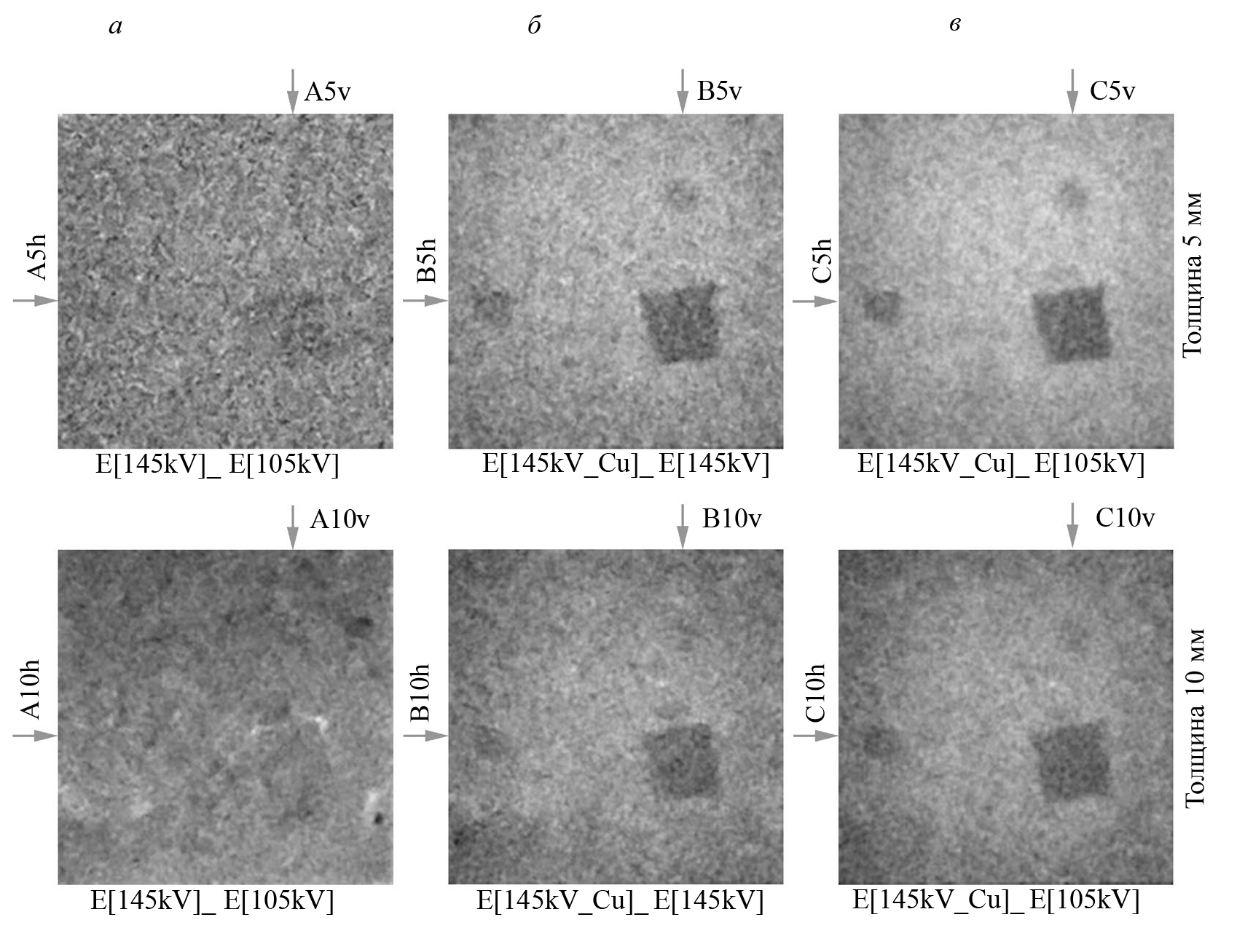 Рис. 7. Двухэнергетическая обработка при сочетании пар изображений, полученных при разных энергетических спектрах излучения. Частицы берилла проявляются как более темные включения (на изображениях имеется 3 частицы берилла, самая крупная имеет грань 5 мм, частица слева — 3 мм, частица сверху — 2 мм). В обозначениях направлений, указанных стрелками, цифра — это толщина образца (5 и 10 мм); v, h — вертикальное и горизонтальное направление соответственно, по которому получено распределение интенсивности яркости пикселей в дальнейшем.