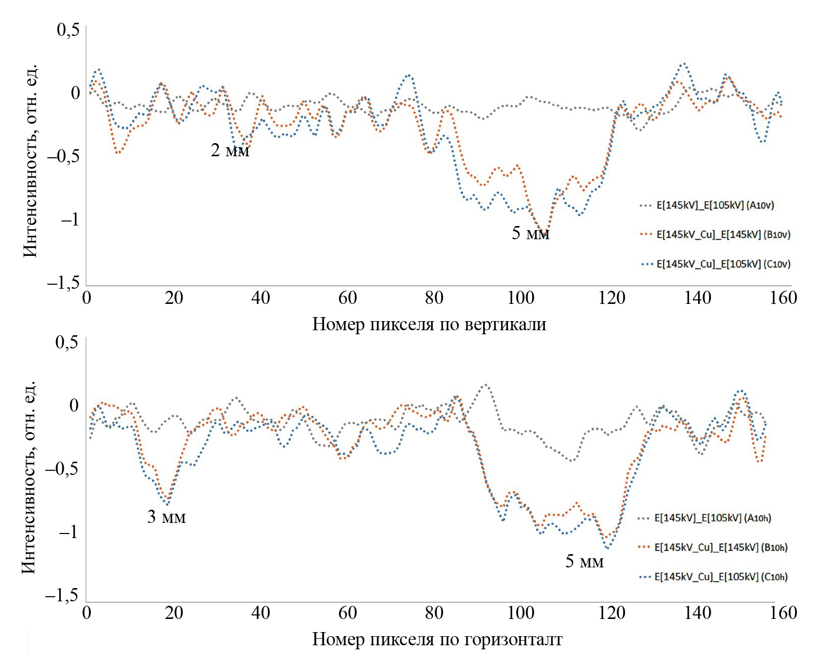 На рис. 8 представлены профили распределения интенсивности пикселей для обработанных при разных спектрах излучения изображений толщиной 5 мм.