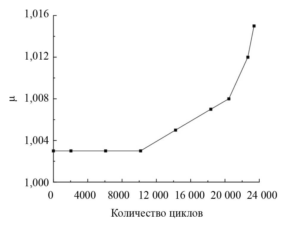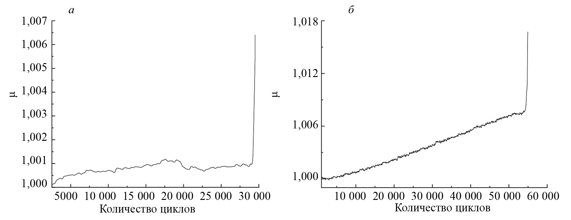 Для образцов 1—6 были сняты зависимости изменения µ от количества циклов непосредственно в процессе испытаний, примеры которых представлены на рис. 1.