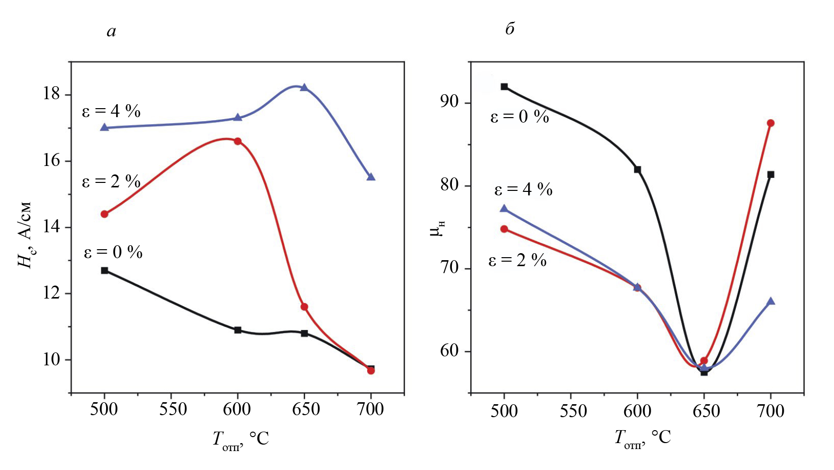 На рис. 1а представлены зависимости коэрцитивной силы от температуры отпуска для образцов без деформации (ε = 0), а также для образцов с относительным удлинением 2 и 4 %. С увеличением ε коэрцитивная сила увеличивается во всем исследованном диапазоне температур отпуска, что свидетельствует об увеличении остаточных механических напряжений. Однако характер изменения коэрцитивной силы в зависимости от температуры отпуска для недеформированных и подвергнутых деформационному воздействию образцов различен: для недеформированных образцов Нс монотонно уменьшается с увеличением Тотп, а для пластически деформированных образцов на зависимостях Hc (Тотп) имеются локальные максимумы в районе 600 °С для образца с ε = 2 % и в районе 650 °С для образца с ε = 4 % (см. рис. 1а). Характер изменения начальной магнитной проницаемости µн от Тотп не меняется с увеличением ε — как для недеформированного (ε = 0), так и для пластически деформированных образцов на зависимостях µн(Тотп) наблюдаются минимумы в районе 650 °С (см. рис. 1б). Деформация приводит к уменьшению значений µн для всех Тотп, за исключением Тотп = 650 °С, где пластическая деформация не приводит к сколько бы то ни было существенному его изменению. Именно в районе Тотп = 650 °С у недеформированных образцов из стали 38ХС наблюдается локальный максимум внутренних микронапряжений, определенный в работе [5] по данным рентгеноструктурного анализа. По всей вероятности, после небольших пластических деформаций (ε ≤ 4 %) высокий уровень внутренних микронапряжений (хаотично распределенных) в закаленных и отпущенных образцах из стали 38ХС остается.