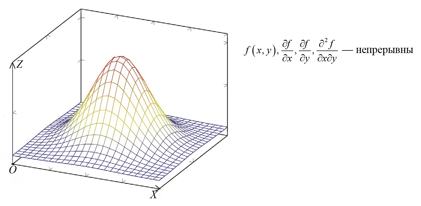 Рис. 1. Пример функции f(x, y), представимой в виде отрезка двойного ряда Фурье в исследуемой области.