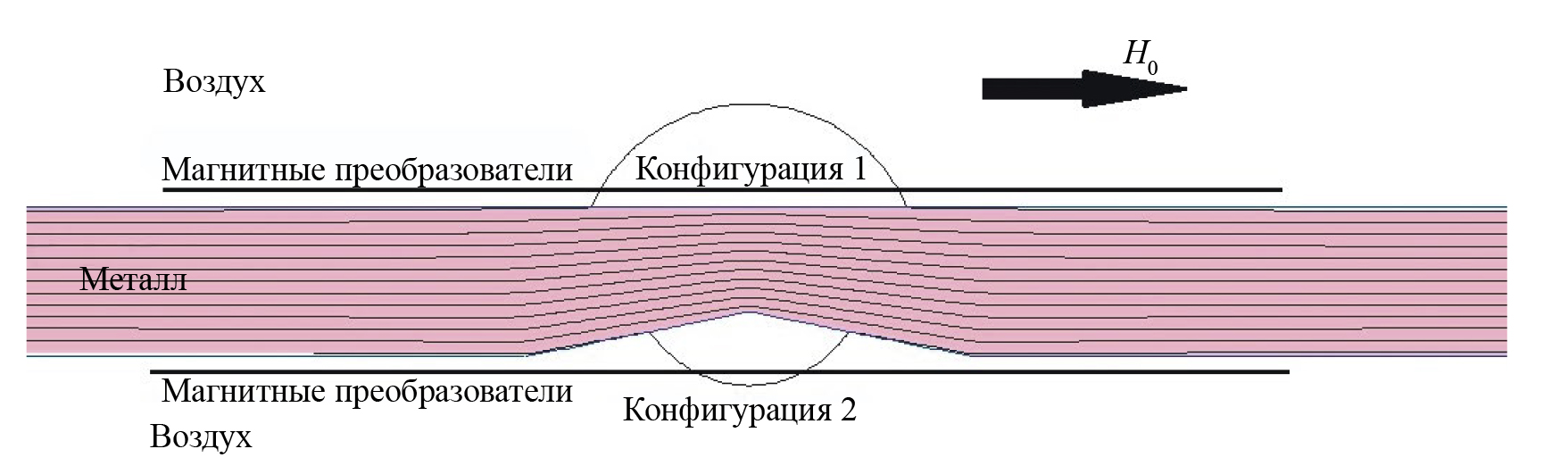 Представленная в работах [10—12] методика вне зависимости от взаимного расположения дефекта и магнитных преобразователей (рис. 2) позволяет решить обратную геометрическую задачу магнитостатики и найти приближенную форму дефекта без использования каких-либо поправочных коэффициентов.