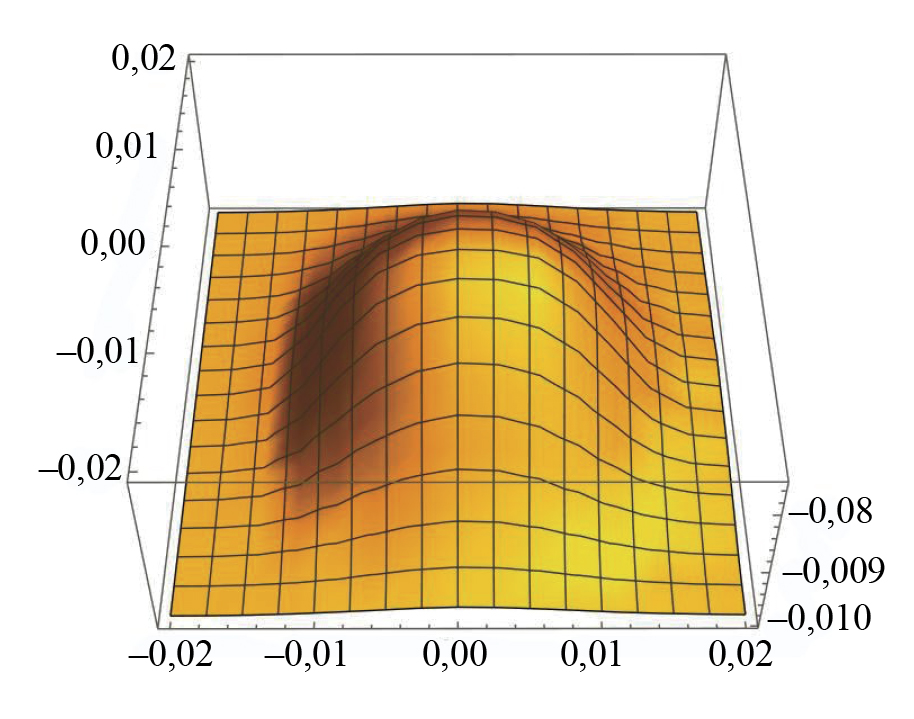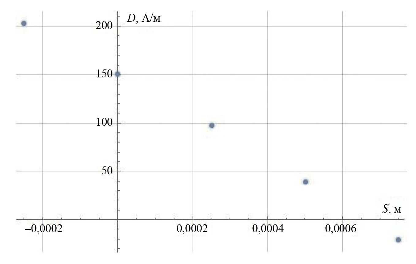 В результате решения обратной геометрической задачи магнитостатики был реконструирован куполообразный дефект со следующими параметрами формы 25×25×2,5 мм. Глубина реконструированного дефекта отличается от глубины реального дефекта на 16,7 %. При этом величина среднего отклонения D составила 150 А/м. Уменьшение глубины дефекта на 0,25 мм приводит к росту D. Минимальное положительное значение D достигается при увеличении глубины дефекта на 0,5 мм, что соответствует геометрическим параметрам реального дефекта.