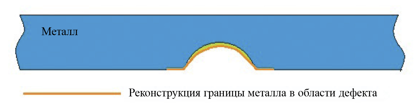 Рис. 5. Поперечное сечение пластины. Реконструкция формы дефекта выполнена с учетом его реальных размеров на поверхности пластины.