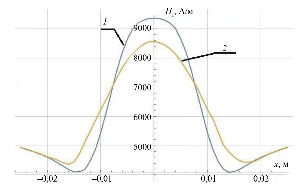 Рис. 6. График значений икс-компонент напряженности магнитного поля на поверхности измерений, на линии, проходящей через центр дефекта по оси ОХ. 1 — значения Hx0 исследуемого дефекта; 2 — значения Hxr реконструированного дефекта.