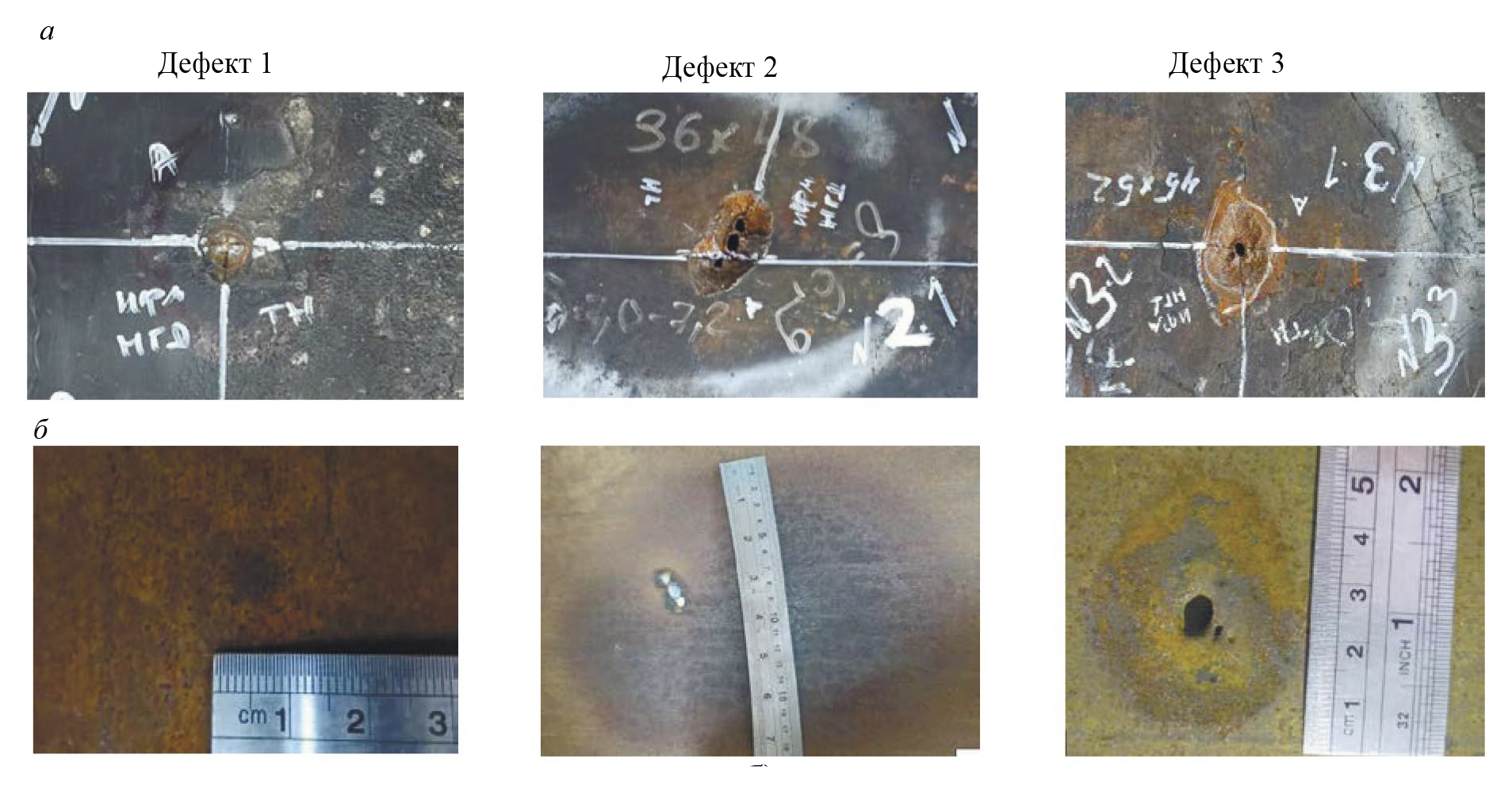 Рис. 1. Повреждения, выявленные при обследовании газопровода: наружная поверхность (а); внутренняя поверхность (б).