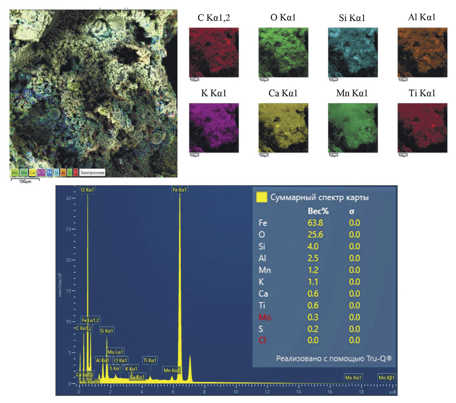 По результатам локального спектрального анализа металла непосредственно в очаге дефектов установлено наличие повышенного количества примесных элементов (кремний, алюминий, калий, кальций, титан) вследствие переноса их из грунта при высокотемпературном воздействии. Присутствие примесных элементов в грунте в месте укладки газопровода подтверждено также качественным элементным анализом (рис. 2).