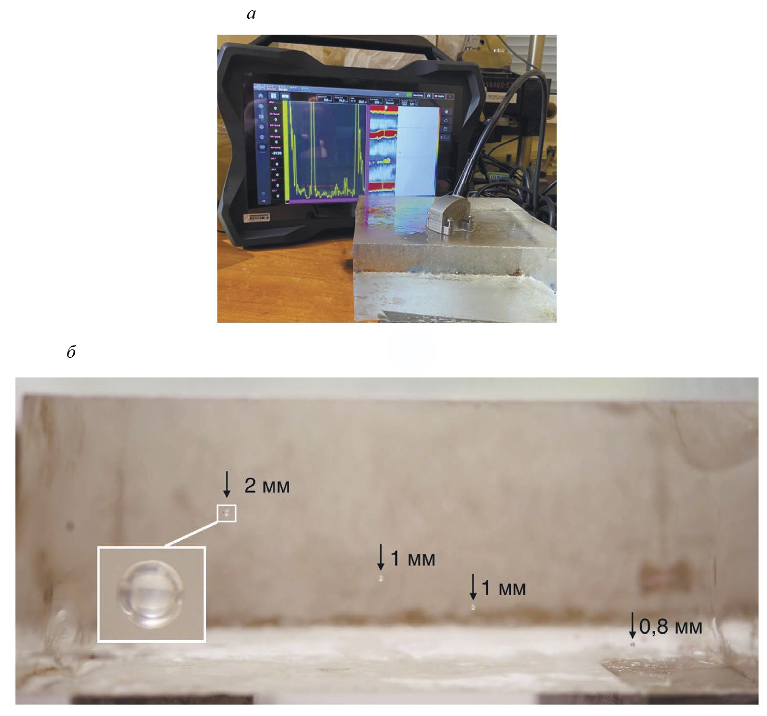 Вначале рассмотрим пример рассеяния на сферических порах, который не очень часто встречается в литературе по ультразвуковой дефектоскопии. На рис. 1 иллюстрируется прозвучивание образца из оптического стекла марки К108 толщиной 61,5 мм с четырьмя газовыми порами диаметром 2,0; 1,0; 1,0; 0,8 мм. Диаметры пор оценены визуально с погрешностью ±0,1 мм. Рассмотренные поры имеют естественное происхождение. Они возникли случайным образом при изготовлении стекла, предназначенного для оптических приборов. Образец, описанный на рис. 1, был забракован по результатам визуального контроля для использования по основному назначению, однако оказался очень полезным в целях проведения экспериментов, описанных в настоящей статье.