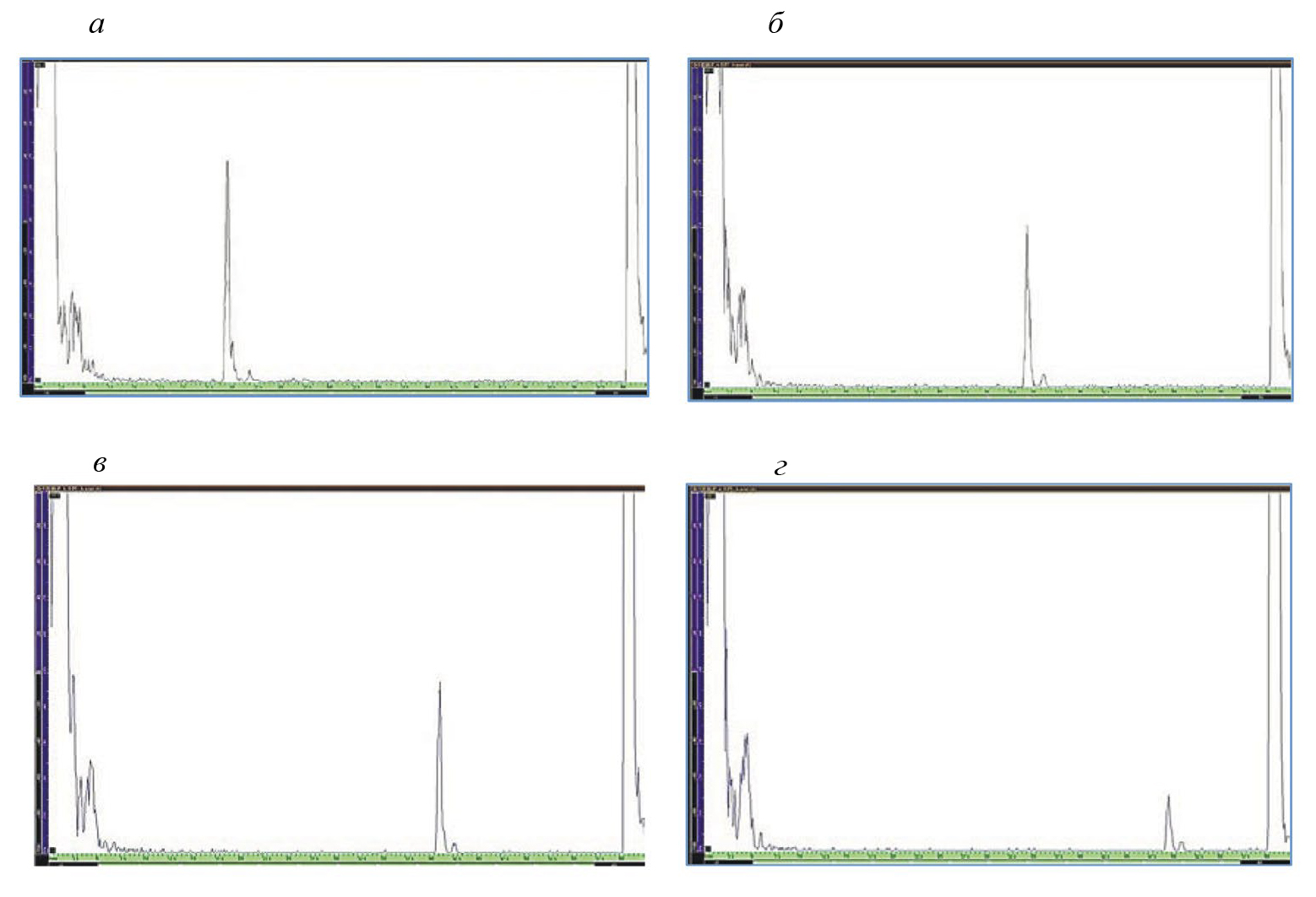 Рис. 3. А-сканы при выявлении в блоке из стекла поперечными волнами пор диаметром: 2 мм (а); 1,0 мм (б); 1,0 мм (в); 0,8 мм (г) (для поры Ø0,8 мм — измерения в направлении против стрелки на рис. 1б)