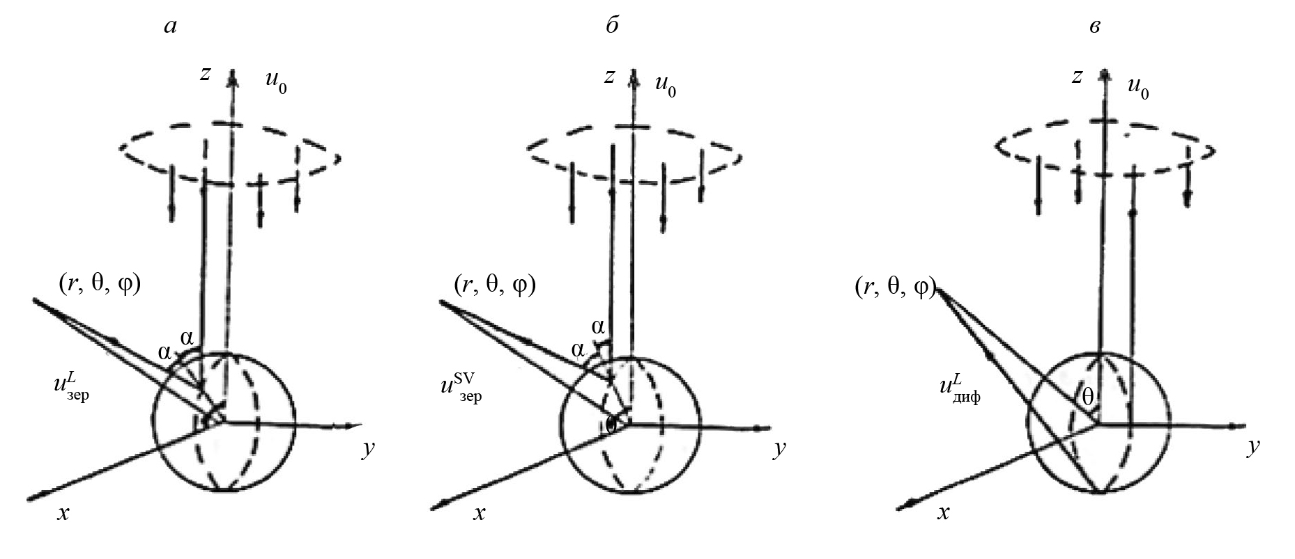 Рис. 4. К рассеянию продольной волны с амплитудой смещения u0 на сферической полости: отражение и трансформация по законам геометрической акустики (а, б); огибание полости (в)