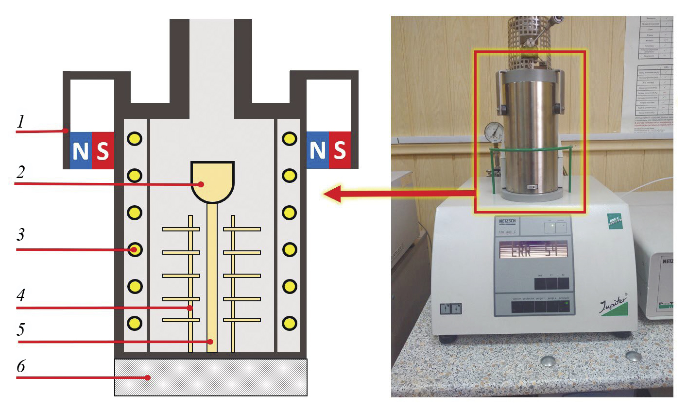Рис. 1. Структура измерительной ячейки и внешний вид синхронного термического анализатора Netzsch STA 449C Jupiter