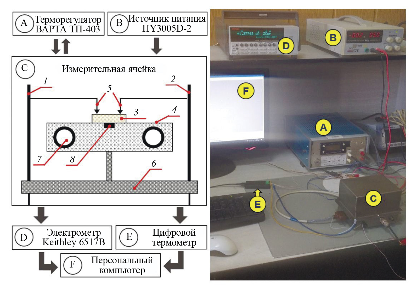 Измерения проводились при заданном напряжении U = 5 В от лабораторного источника питания HY3005D-2, подключенного к стрежню 1. Вывод на электрометр Keithley 6517B обеспечивался стержнем 2. Ферритовый образец 3 размещался на полированной поверхности столика 4, изготовленного из немагнитной нержавеющей стали. Два заостренных прижимных контакта 5 служили зондами на поверхности ферритовой таблетки. Электроизоляция между двумя электрическими выводами обеспечивалась карболитовым основанием 6. Для нагрева образца использовался встроенный в столик спиральный нагреватель 7, управляемый терморегулятором «ВАРТА» ТП-403 и дифференциальной хромель-алюмелевой термопарой 8.