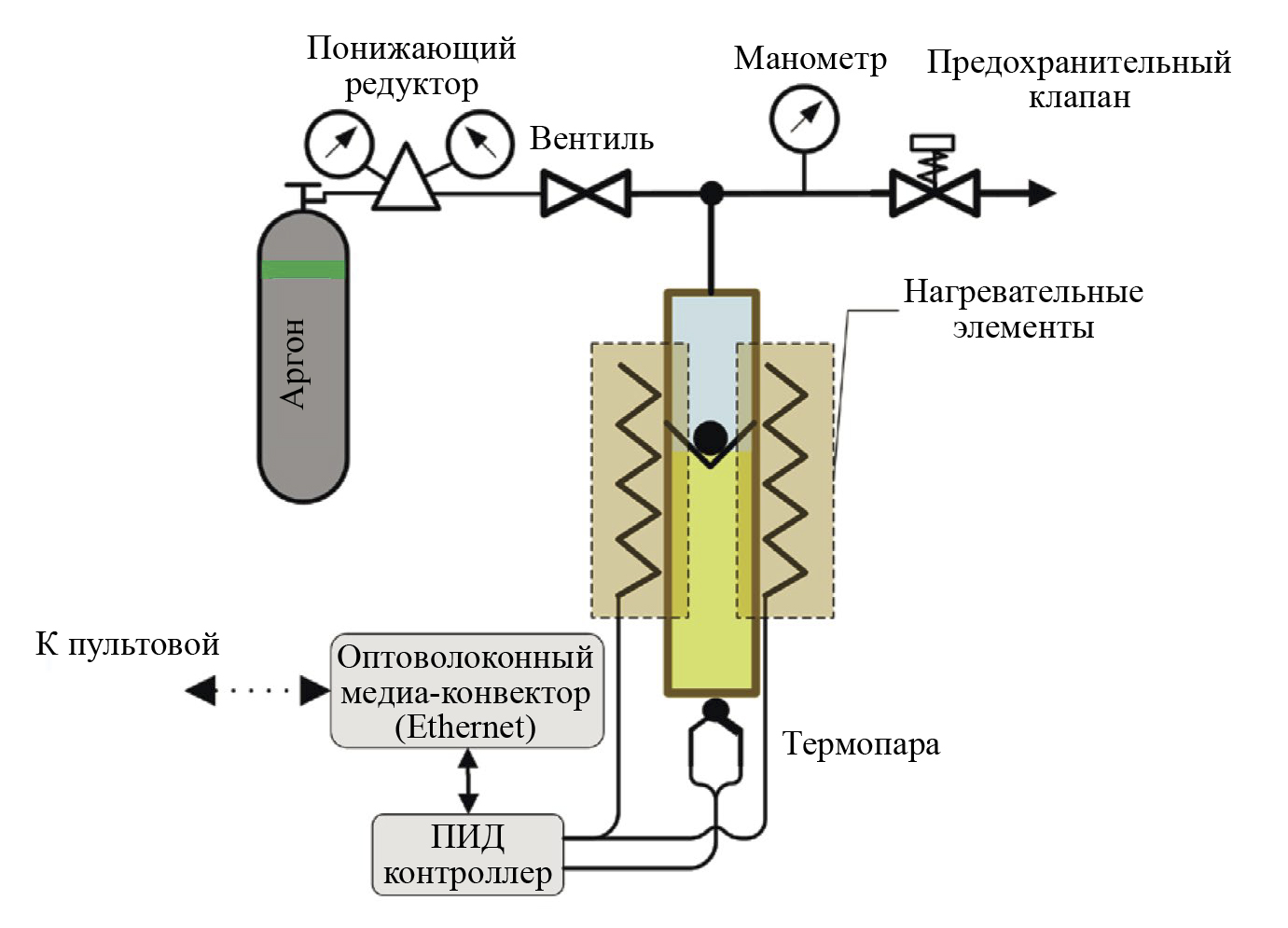 Конструкция экспериментальной установки позволяла дистанционно переворачивать трубку вокруг горизонтальной оси, запуская процесс падения шара из карбида вольфрама. Нагрев трубки осуществлялся с помощью двух резистивных электронагревательных элементов. Для контроля температуры использовались два термопарных датчика фирмы Omega типа K с погрешностью измерений ±2,5 °С. Первый из датчиков был непосредственно вмонтирован в латунный держатель нагревателя, второй был установлен в торце титановой трубки. Управление нагревом, а также считывание сигналов с термопарных датчиков осуществлялось с помощью регулятора UR4848xA Universal Controller фирмы Wachendorf. Для создания повышенного давления в титановой трубке используется буферный газ—аргон с заявленной чистотой по содержанию примесей 99,998 % (20 ppm). Давление газа регулировалось с помощью предохранительного пружинного клапана фирмы Swagelok 177-R3A-K1-C, рассчитанного на рабочее давление от 51,7 до 103 бар. В проведенных экспериментах предохранительный клапан был настроен на давление 90 бар с ошибкой установки давления до 20 %.