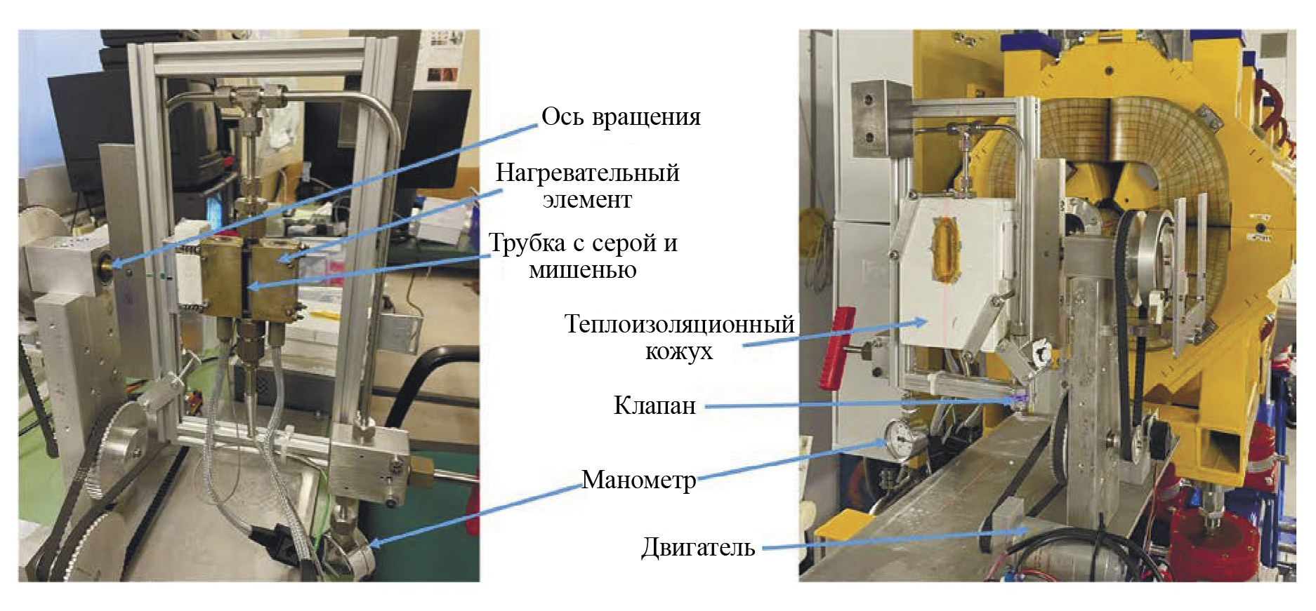 Рис. 2. Установка для измерения вязкости серы. Слева — фотография поворотного узла с титановой трубкой, заполняемой серой при снятом термокожухе. Справа — общий вид установки на фоне квадрупольных электромагнитных линз (желтого цвета) системы формирования протонно-радиографических изображений протонного микроскопа PRIOR-II