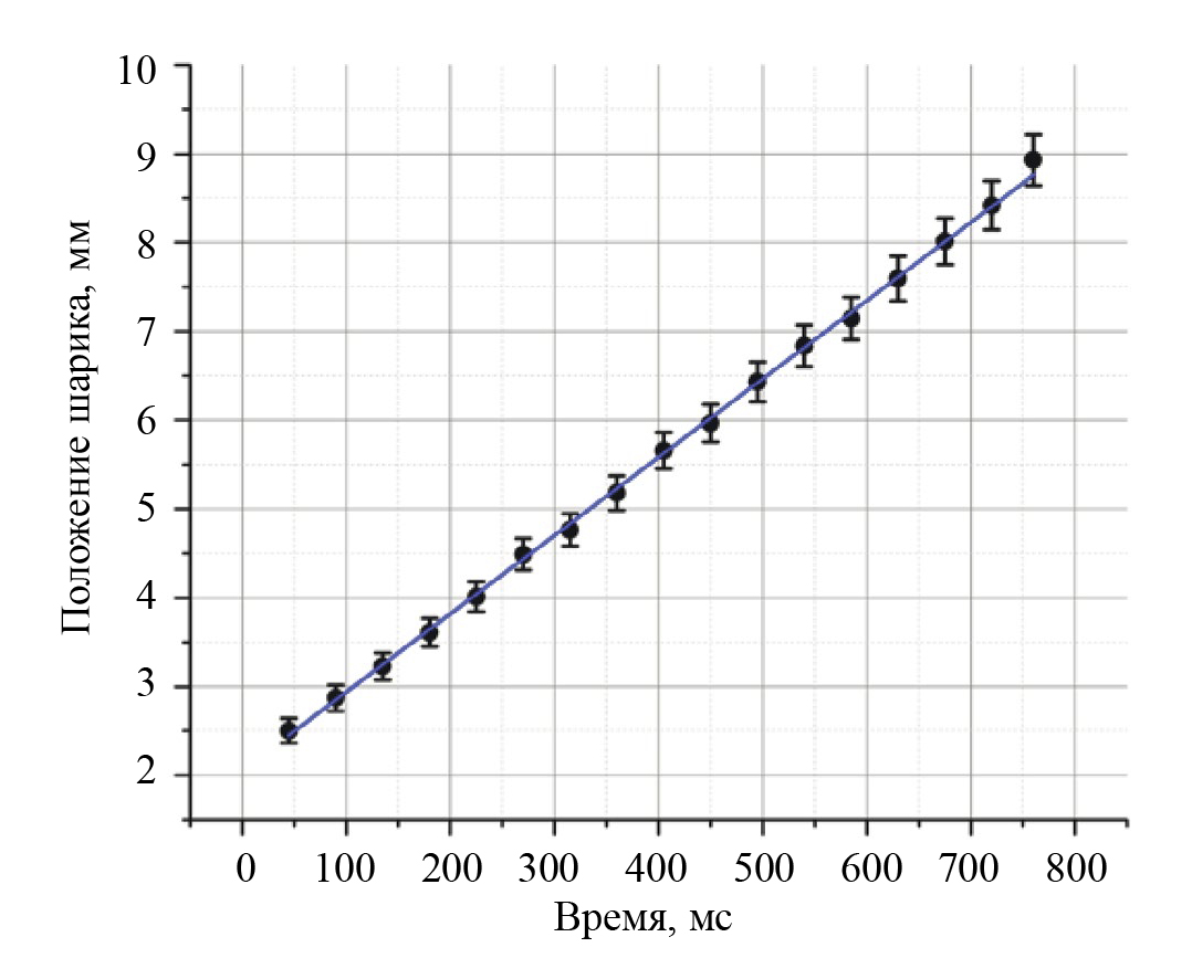 Протонно-радиографическое изображение формировалось на сцинтилляционном детекторе CsI:Tl в виде пластины 120×120 мм2 и толщиной 6 мм и регистрировалось с помощью цифровой камеры PCO DIMAX. Режим работы цифровой камеры позволял получить серию из 45 кадров с экспозицией 40 мс каждого кадра и временем задержки между кадрами 5 мс. При обработке экспериментальные данные брались из одного цикла нагрева. На рис. 3 показано несколько протонно-радиографических изображений, полученных в различные моменты времени от начала падения шарика в расплаве серы. Как видно из графика, приведенного на рис. 4, движение шарика носит равномерный характер.