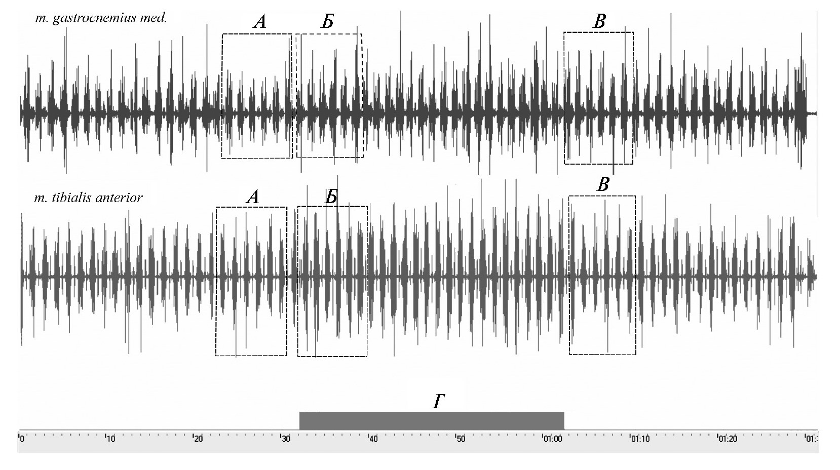 А — участок записи биопотенциалов мышц без чрескожной электрической стимуляции спинного мозга (ЧЭССМ); Б — участок записи биопотенциалов мышц во время ЧЭССМ; В — участок записи биопотенциалов после ЧЭССМ; Г — отметка ЧЭССМ.