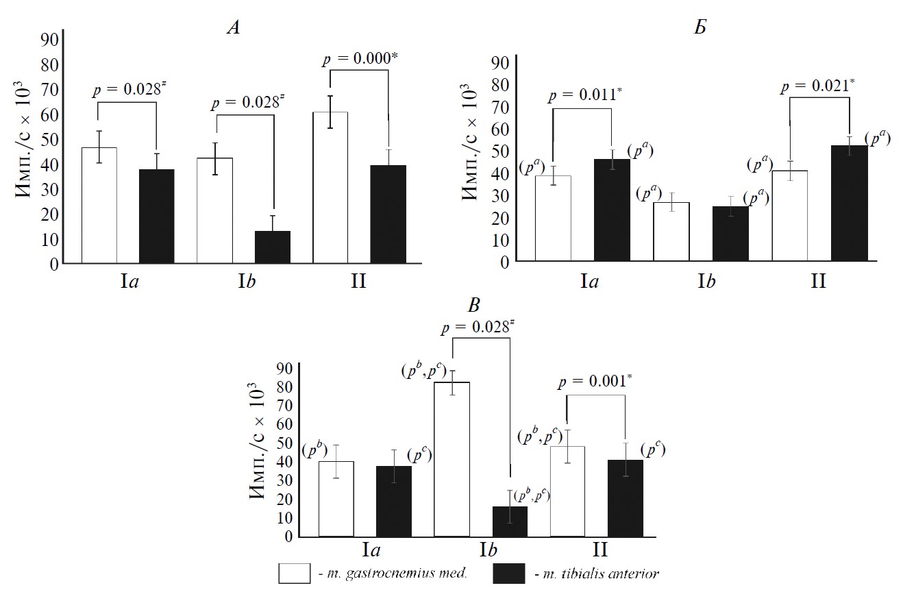 Характеристики импульсной активности афферентных волокон и ЭМГ-паттернов мышц-антагонистов голени при ходьбе со стимуляцией спинного мозга. Данные рис. 3, Б свидетельствуют, что на фоне применения электрической стимуляции спинной мозг во время ходьбы активность афферентов Ia и группы II GM была ниже, чем аналогичных афферентов TA (р = 0.011; р = 0.021). Стимуляция спинного мозга вызывала наибольшую импульсацию афферентов Ia и II волокон GM и TA по сравнению с афферентами Ib мышц-антагонистов (GM: рIa — Ib = 0.002, рII — Ib = 0.002; TA: рIa — Ib = 0.001, рII — Ib = 0.006). Активность афферентов II ТА была выражена больше по сравнению с афферентами Ia (рIa — II = 0.007), а афференты Ia и II GM проявляли одинаковую импульсную активность (рIa — II = 0.470).