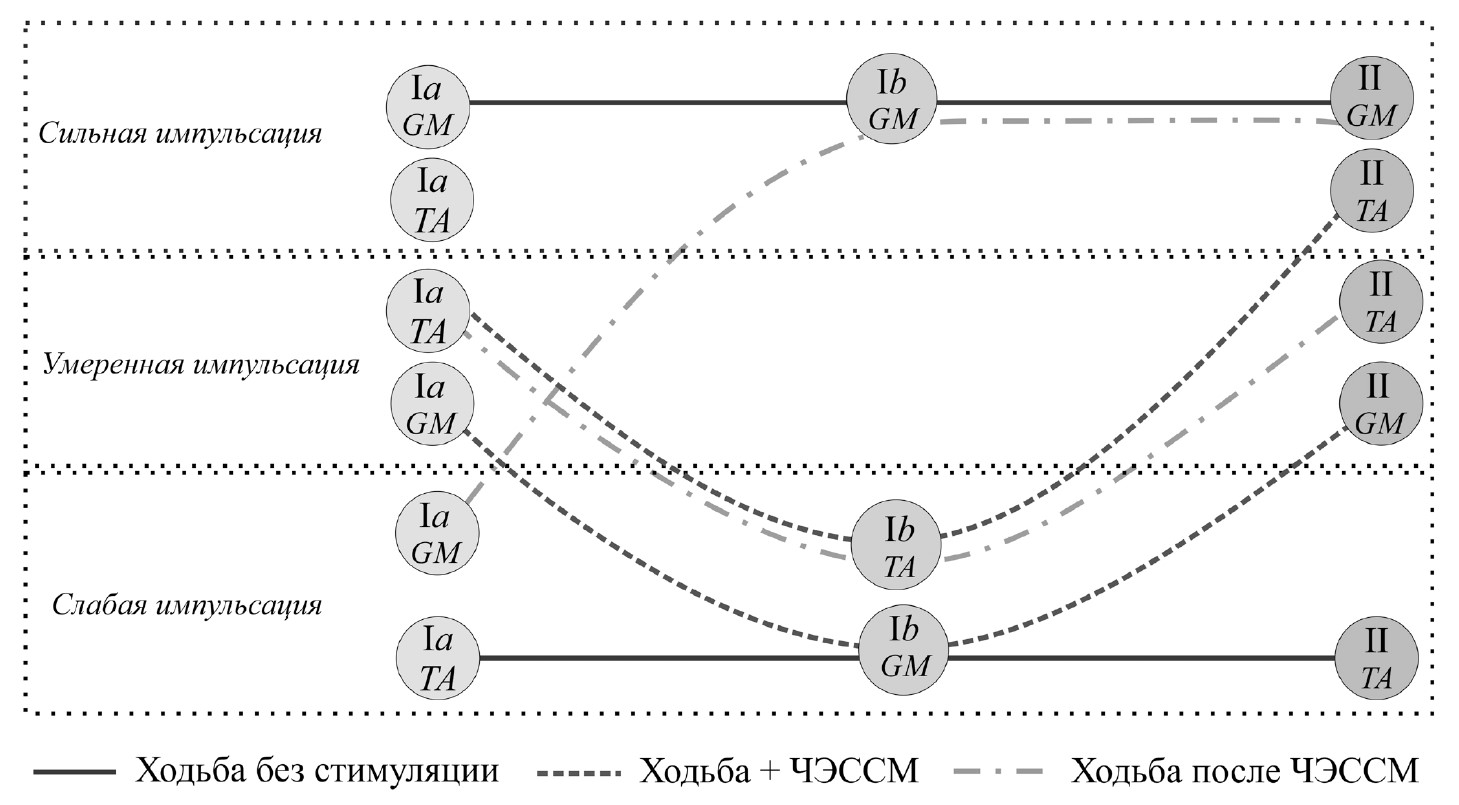 Механизм действия ЧЭССМ основан в последовательной активации афферентных волокон больших и средних диаметров, локализованных в дорсальных корешках спинного мозга, с целью повышения возбудимости мотонейронного пула [12–14]. Вместе с тем остается открытым вопрос о функциональной активности первичных и вторичных афферентов, их взаимодействии при ЧЭССМ на фоне выполнения различных локомоторных движений.