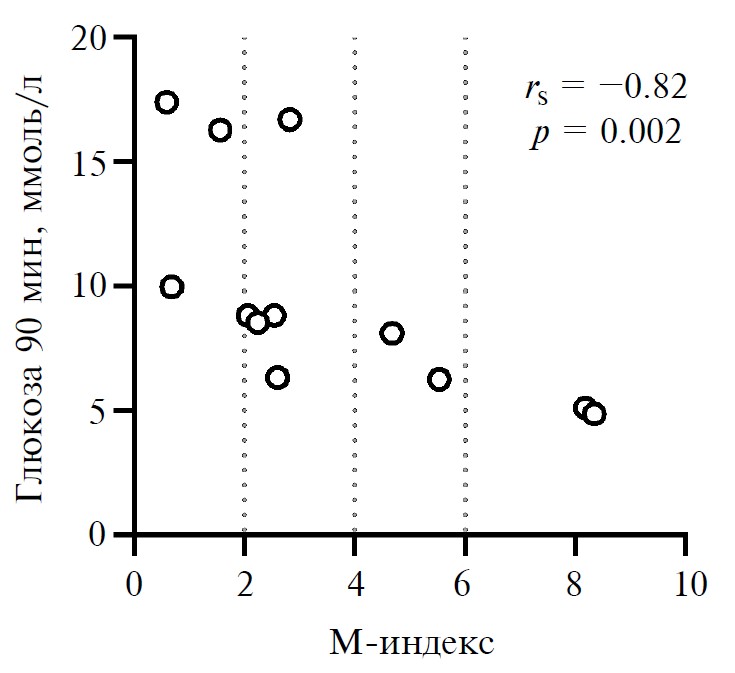 Рис. 3. Взаимосвязь между содержанием глюкозы в крови через 90 мин после приема смешанной пищи (6 ккал/кг массы тела) и М-индексом — системный показатель чувствительности к инсулину.