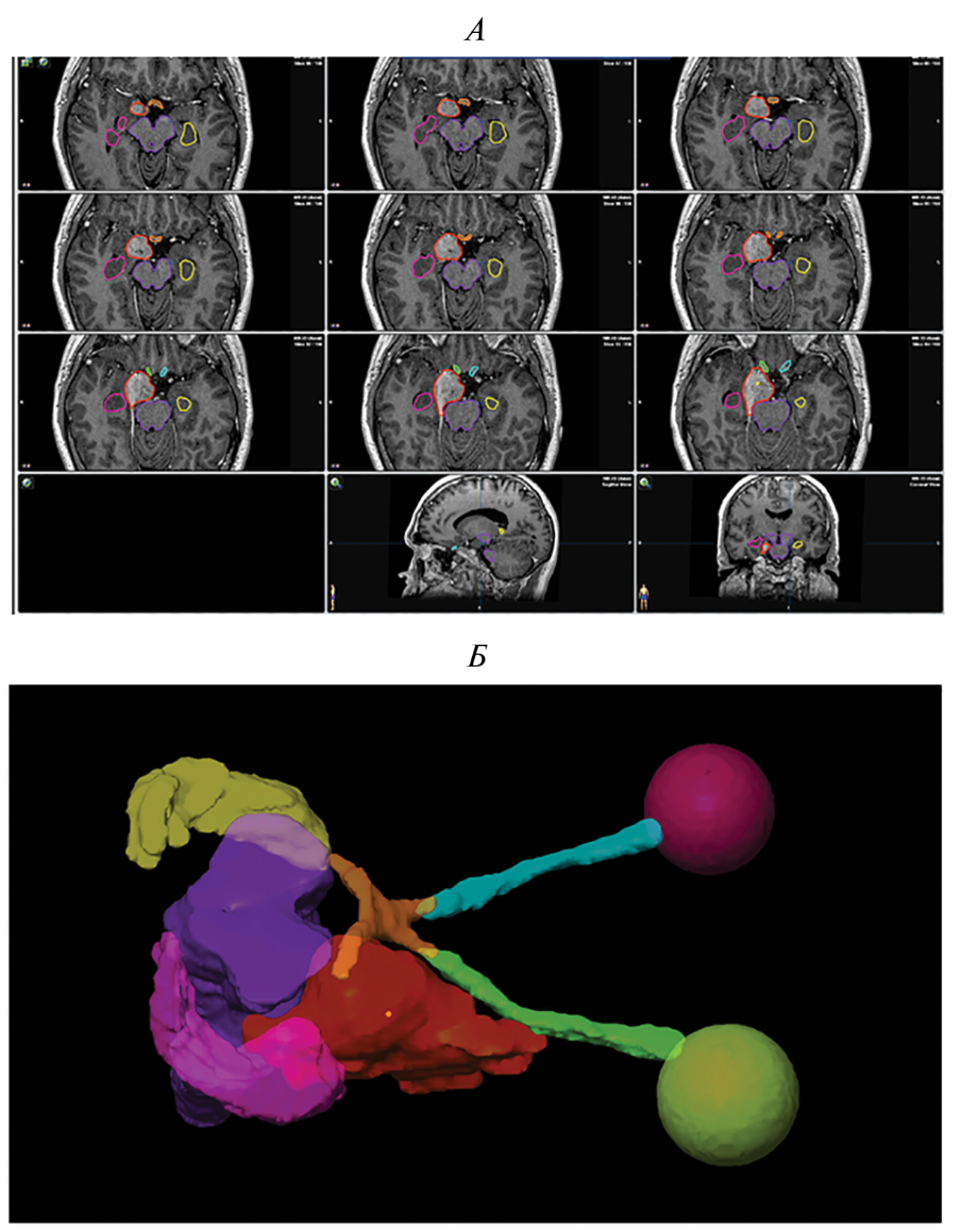 В исследовании принимали участие 28 пациентов с МХСО от 30 до 65 лет, средний возраст выборки 51.18 (SD = 10.16); 24 женщины. Ни у кого из пациентов ранее в анамнезе не было ЛТ и нейрохирургических вмешательств. Во всех случаях диагноз “доброкачественной менингиомы” был установлен на основании типичной клинической картины и данных нейровизуализации. Всем больным проводили топометрическую МРТ головы в аксиальной проекции в режиме 3D SPGR (до и после введения контрастного вещества с толщиной срезов 1.0 мм) и в режиме Т2 (до введения контраста, с толщиной срезов 2.0 мм). Для точной оценки объема опухоли и ее пространственного расположения проводили оконтуривание опухоли и ГП в системе дозиметрического планирования iPlan (BrainLab). Оконтуривание ГП проводили на основании протокола RTOG 0933 и работ [32] на аксиальных изображениях, последовательно вручную на каждом срезе с использованием всех доступных модальностей. На рис. 1 представлены примеры послойного оконтуривания ГП и опухоли (рис. 1, А), а также трехмерной реконструкции опухоли и основных критических структур (рис. 1, Б). Красным цветом выделена опухоль, розовым — правый ГП, желтым — левый ГП.