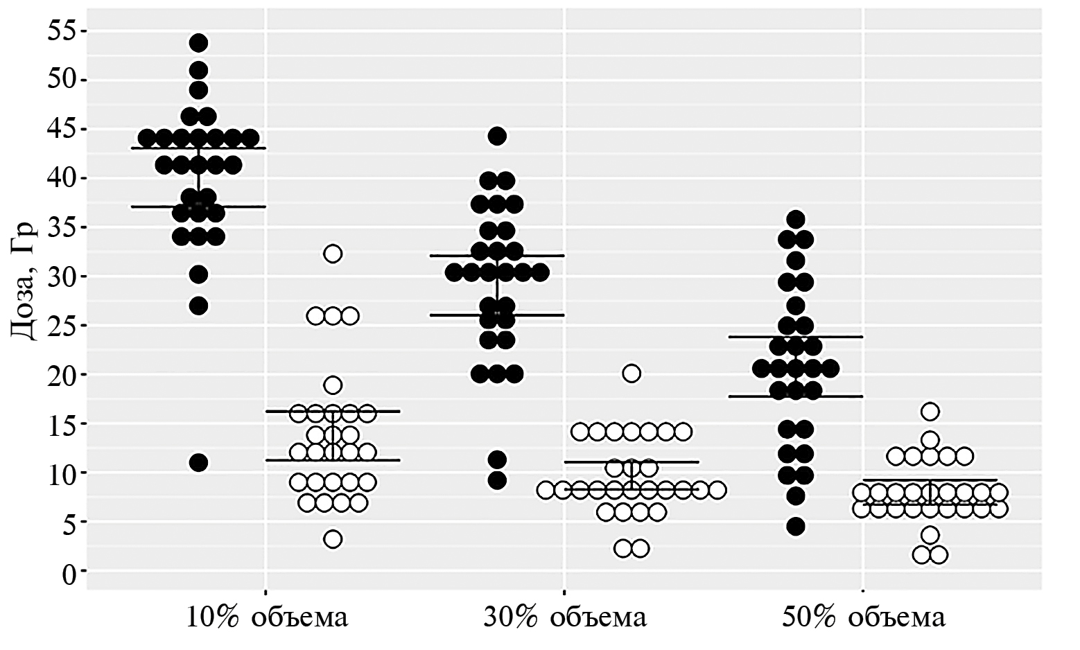 Однородная выборка из 28 пациентов с МХСО, прилежащими к ГП, образовала две группы, различающиеся по стороне расположения опухоли. 15 пациентов составили группу ЛРО, 13 – группу ПРО. Эти две группы были сопоставимы по демографическим, клиническим и морфометрическим (объем опухоли, ее расположение относительно ГП) характеристикам. Не было различий между группами и по параметрам лучевого воздействия. В среднем для выборки дозовая нагрузка на нормальные ткани (15 см3) составила 47.1 Гр (35.2–56.7 Гр). Дозовые нагрузки на 10, 30 и 50% объема ипсилатерального ГП составили соответственно 40.0 (11.0-53.8 Гр), 29.3 (9.2-44.3 Гр) и 20.1 Гр (4.5-35.8 Гр). Распределение индивидуальных значений дозовой нагрузки на ГП представлено на рис. 2.