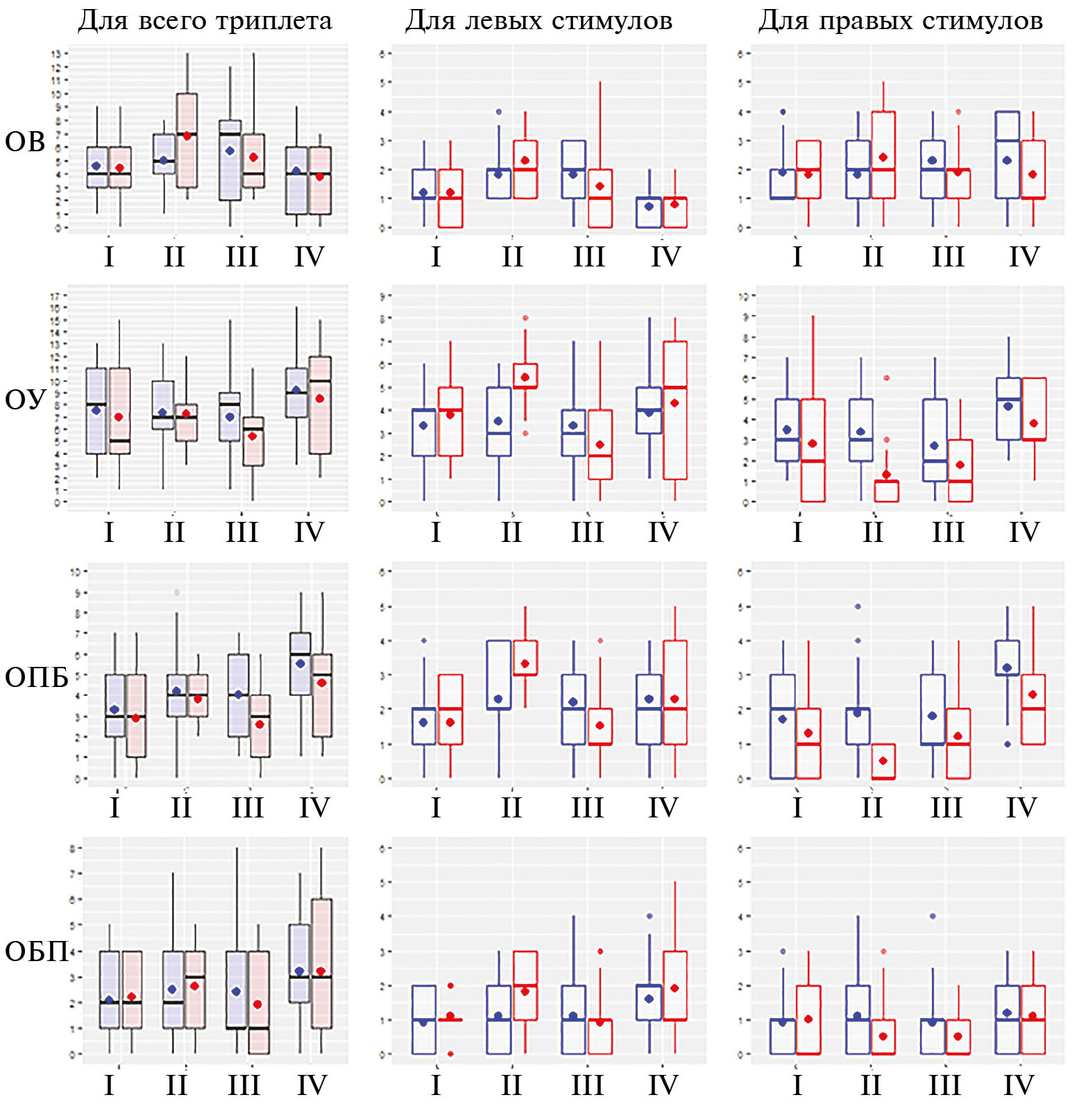 Ошибки узнавания стимулов в точке I не различались между группами, не имели различий в полях зрения, все находились в нормативном диапазоне. В точке II ошибки У стимулов в группе ЛРО количественно не изменяются, а в группе ПРО — в разных полях зрения претерпевают динамику в противоположных направлениях: в левом поле зрения резко нарастают (р = 0.01), а в правом поле зрения — наоборот, их становится меньше (р = 0.01). С переходом к точке III различие между группами постепенно нивелируется за счет динамики противоположного направления по полям зрения у пациентов ПРО. В точке IV ошибки У нарастают параллельно в обеих группах в двух полях зрения, и межгрупповые различия пропадают.