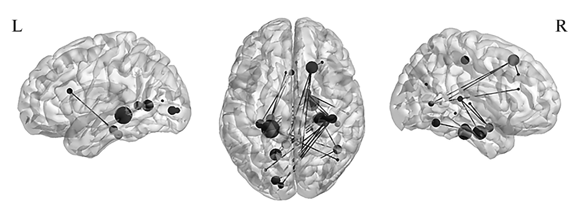 Рис. 1. Показатели коннективности нейросети на частоте α1-ритма у мужчин: эффект генотипа. Каждый круг представляет собой узел, размер круга пропорционален числу связей с другими узлами. На рисунке представлены все узлы и связи (n = 33), которые более выражены у Val/Met-носителей по сравнению с Val/Val (FWEcorrected p = 0.013).