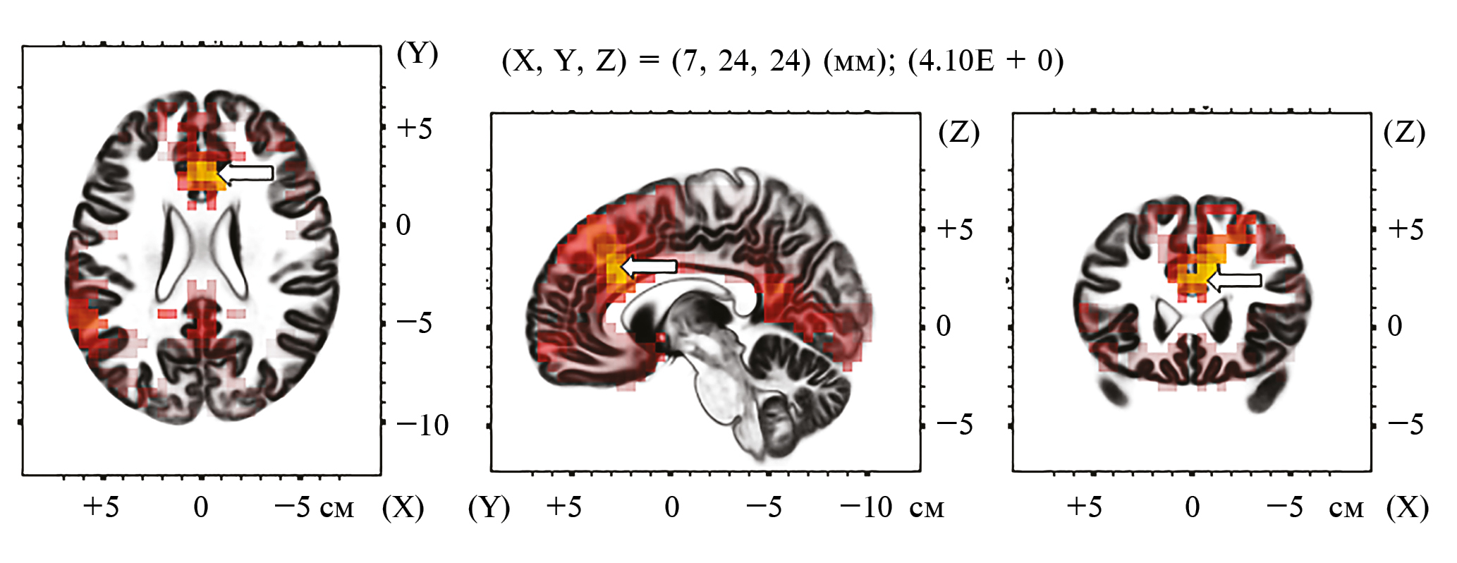Интересно, что спектральная плотность θ-ритма в условии конкуренции по сравнению с индивидуальным выполнением была больше, но не достигала уровня статистически значимых различий. Можно предположить, что помимо процессов внимания вклад в различия, выявленные в θ-диапазоне, могут вносить и другие факторы. Статистически значимые различия в θ-частотном диапазоне, помимо выявленных различий при сравнении условий кооперации и конкуренции, также были обнаружены при сравнении кооперации с индивидуальным выполнением. В нашем исследовании была обнаружена наименьшая спектральная плотность θ-ритма во время сотрудничества в структурах мозга, охватывающих медиальную префронтальную кору, по сравнению с другими видами игры. Известно, что медиальная префронтальная кора является передним узлом дефолт системы мозга (ДСМ) и эта система участвует в процессах социальных взаимодействий и процессах, связанных с самосознанием [29, 30]. Согласно исследованию R. Scheeringa et al. [31], θ-ритм в медиальных фронтальных отделах мозга отрицательно коррелировал с уровнем потребления кислорода согласно показателю фМРТ-сигнала в структурах ДСМ. Можно предположить, что значимый вклад в снижение спектральной плотности θ-ритма может вносить активность ДСМ, которая, вероятно, будет в большей степени включена во время сотрудничества с партнером по сравнению с другими видами игры. Таким образом, выявленная в нашем исследовании сниженная плотность источников θ-ритма в медиальной префронтальной коре во время кооперации, по сравнению с индивидуальным выполнением и конкуренцией, может быть связана с активностью ДСМ в процессе взаимодействия с партнером при построении совместной фигуры.