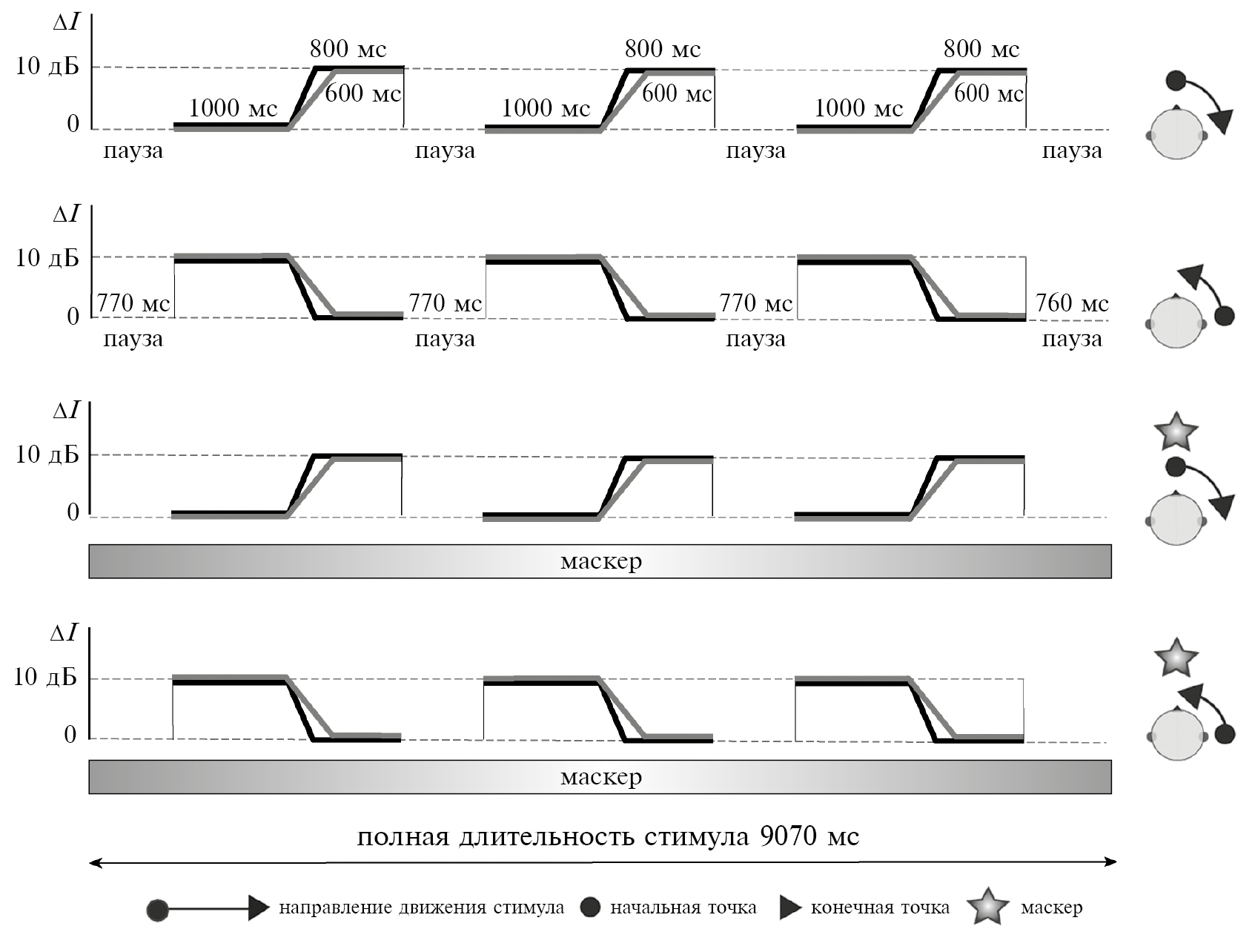 Сведения относительно маскировки движущихся стимулов диотическим маскером довольно фрагментарны. Исследована зависимость уровня маскировки от того, в какой части тестового стимула величина ΔT или ΔI была минимальной. Наиболее сильной маскировке были подвержены сигналы с ΔT = 0 (совпадающие с маскером) в начале, тогда как для сигналов с ΔI уровень маскировки не зависел от частотно-временного взвешивания бинауральной информации [7]. Было показано, что движение звукового стимула приводит к улучшению его восприятия по сравнению с неподвижным сигналом, расположенным в его начальной точке [5, 8]. С другой стороны, есть свидетельства, что движение тестового стимула является более слабым признаком по сравнению с пространственным разнесением маскера и неподвижного сигнала: движение не способствовало разделению конкурирующих звуковых потоков [9] и не усиливало пространственное освобождение от маскировки [10].