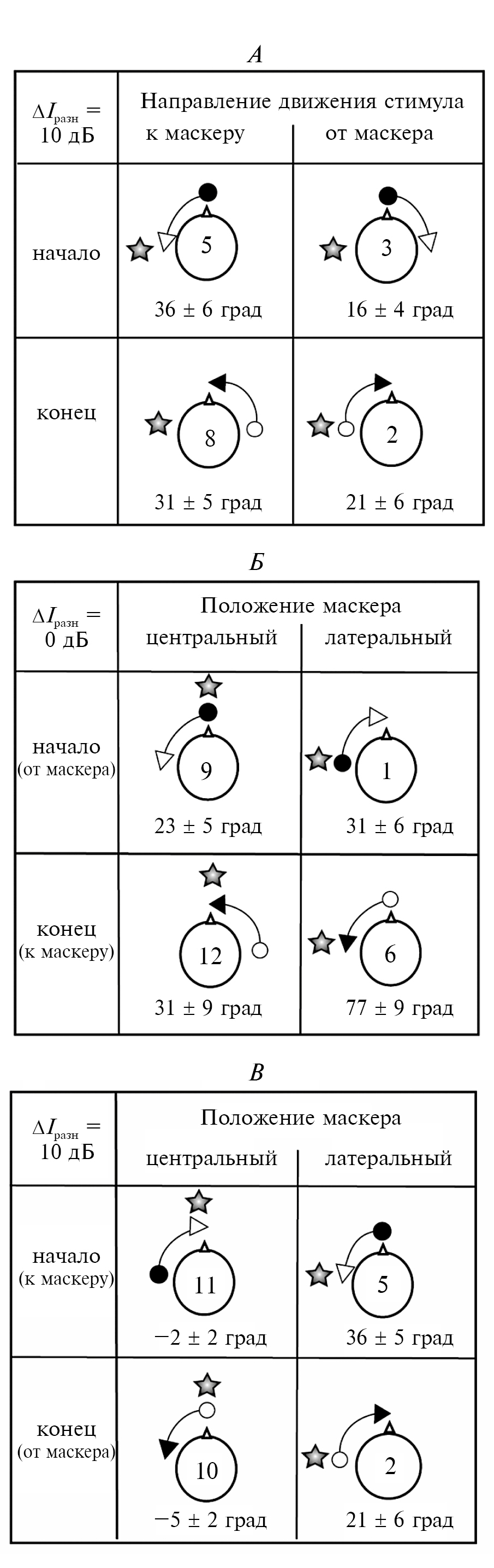 Рис. 4. Схема взаимного расположения маскера, начальных и конечных точек сигналов, вошедших в дисперсионный анализ. А — двухфакторный анализ смещения центральных точек при латеральных маскерах (ΔIразн = 10 дБ), Б, В — трехфакторный анализ смещения центральных и латеральных точек под действием ближайших к ним маскеров (Б: ΔIразн = 0 дБ) и при разнесении сигнала и маскера на расчетное угловое расстояние 90 град (В: ΔIразн = 10 дБ). На стрелках круг соответствует началу траектории, треугольник — концу траектории. Если точка входит в анализ, соответствующий элемент обозначен черным, если не входит — белым. Число на схеме головы — номер соответствующей точки на рис. 2. Внизу под головой — среднее значение смещения воспринимаемого положения соответствующей точки в условиях маскировки по сравнению с предъявлением в тишине.