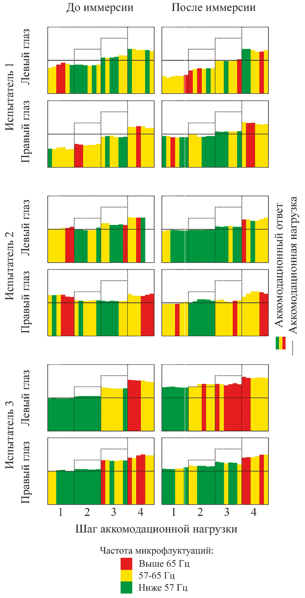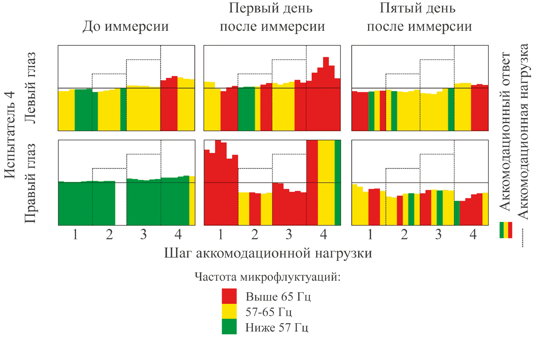 Пунктирные столбцы отражают аккомодационную нагрузку, задаваемую прибором (в измерении было 4 ступени нагрузки). Высота сплошных столбцов отражает аккомодационный ответ глаза на нагрузку. Цвет сплошных столбцов отражает частоту микрофлуктуаций. Для всех трех испытателей выраженных изменений после пребывания в иммерсионной среде не выявлено.