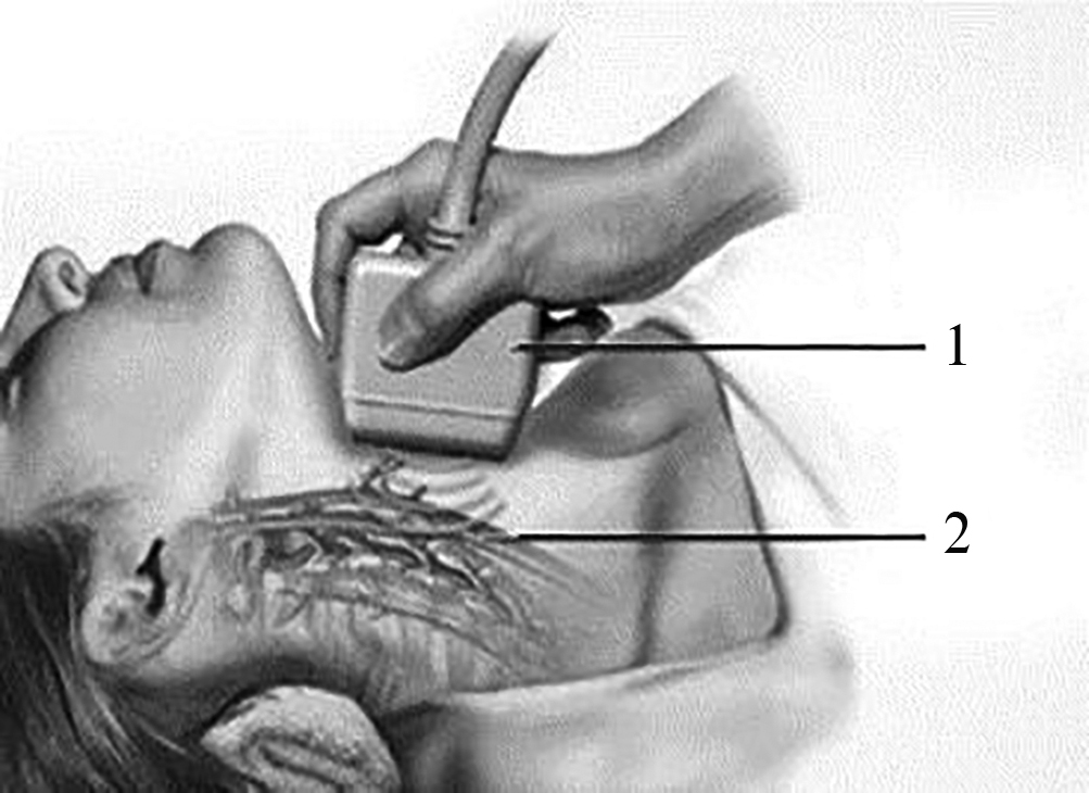 Рис. 1. Метод проведения дуплексного сканирования экстракраниального отдела брахиоцефальных артерий. 1. Ультразвуковой датчик. 2. Сонная артерия.