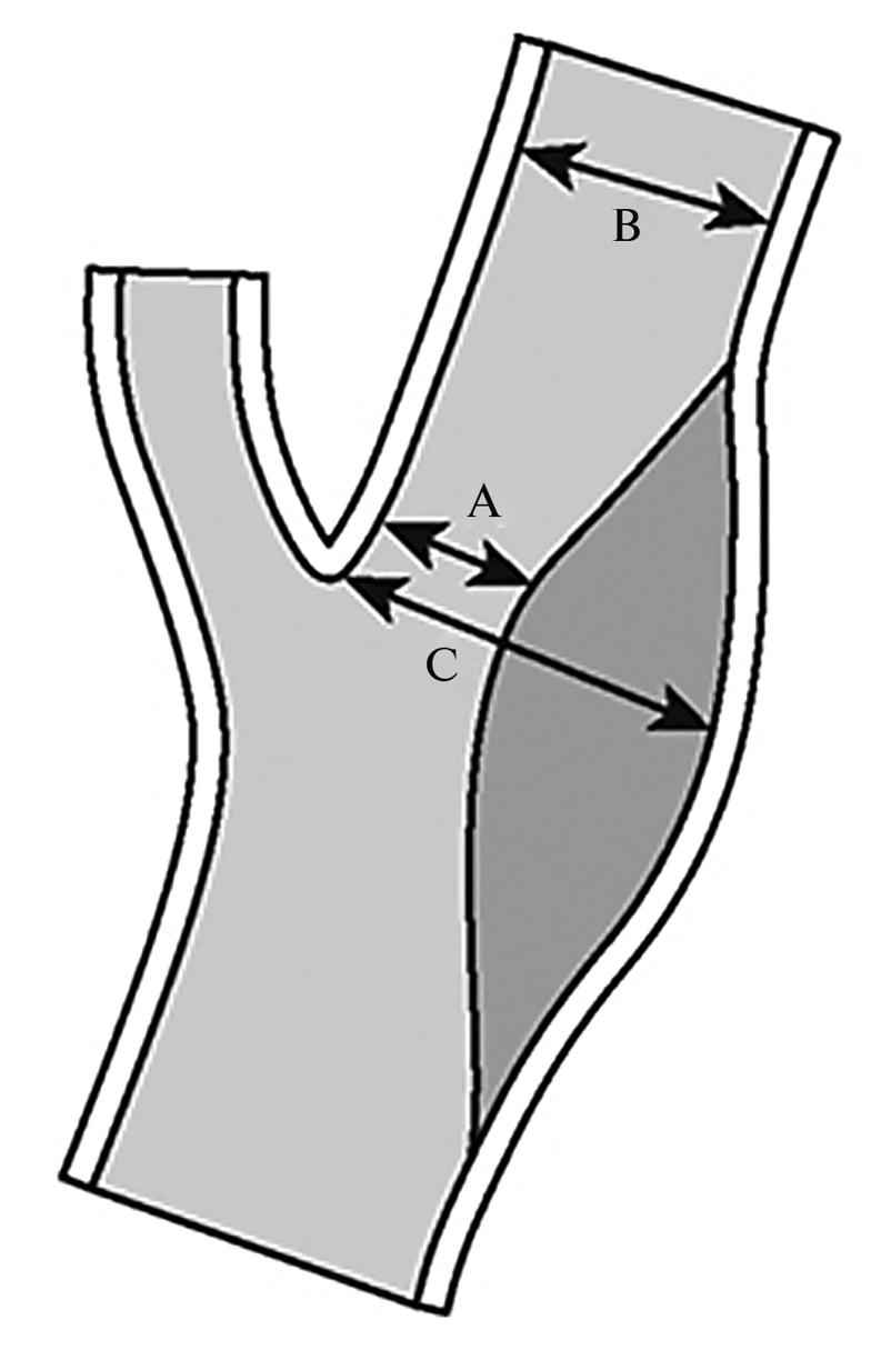 Рис. 2. Метод определения степени стенозирования ECST = 100 × (С — А)/С. А, В, С — обозначение отрезков.